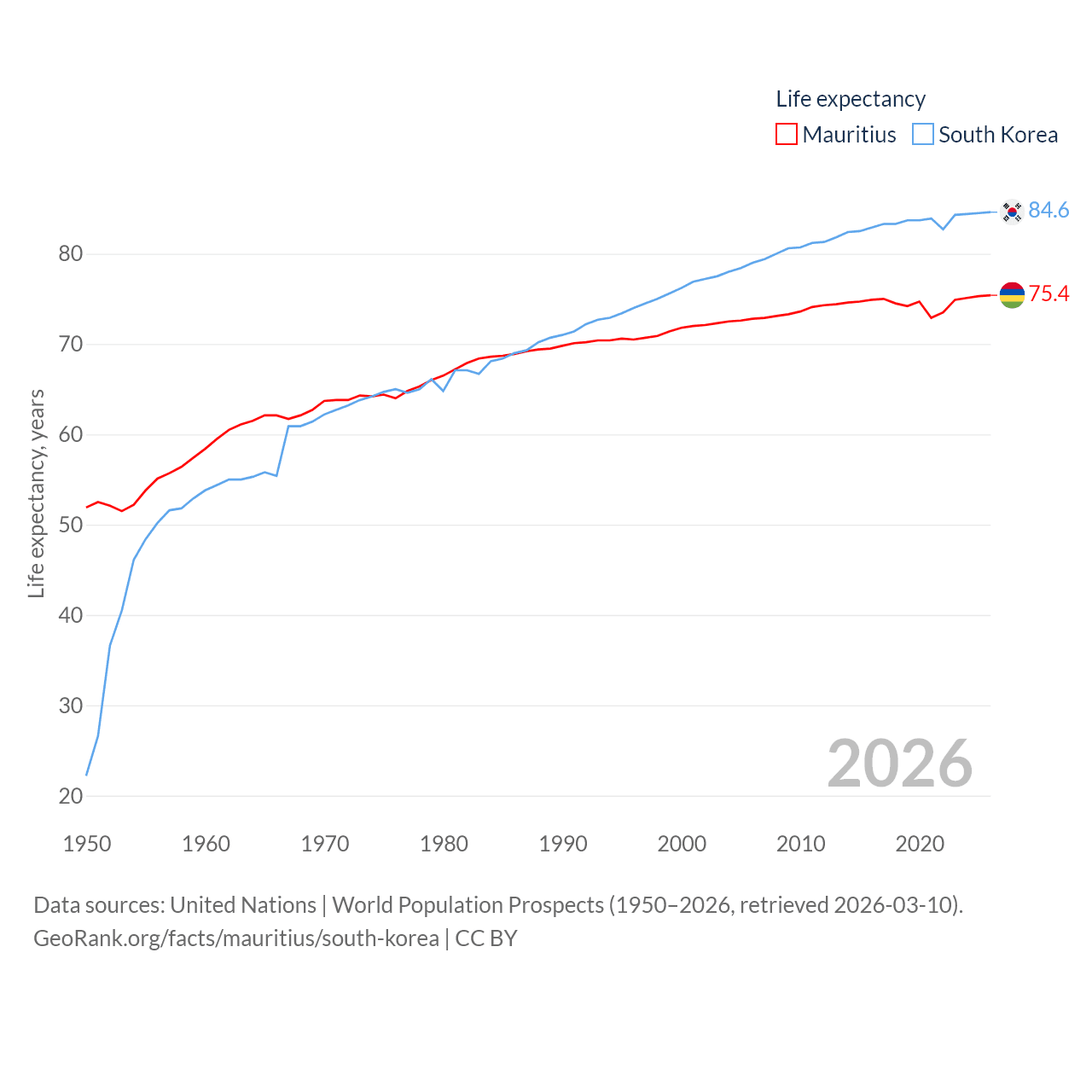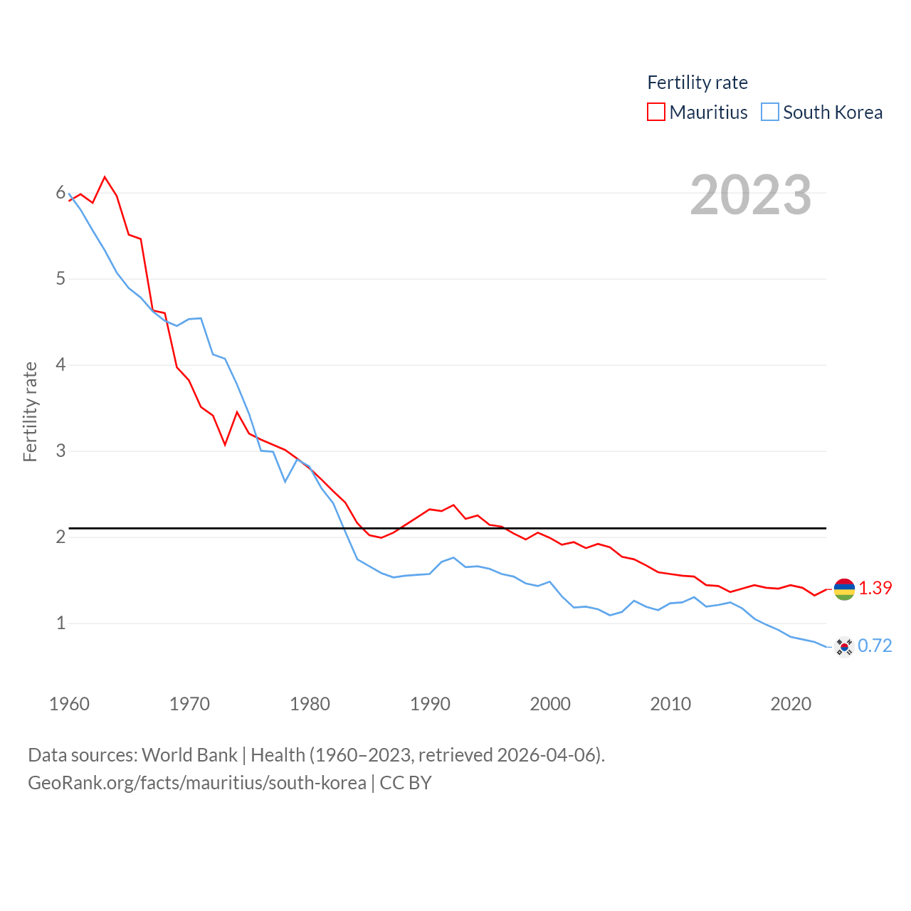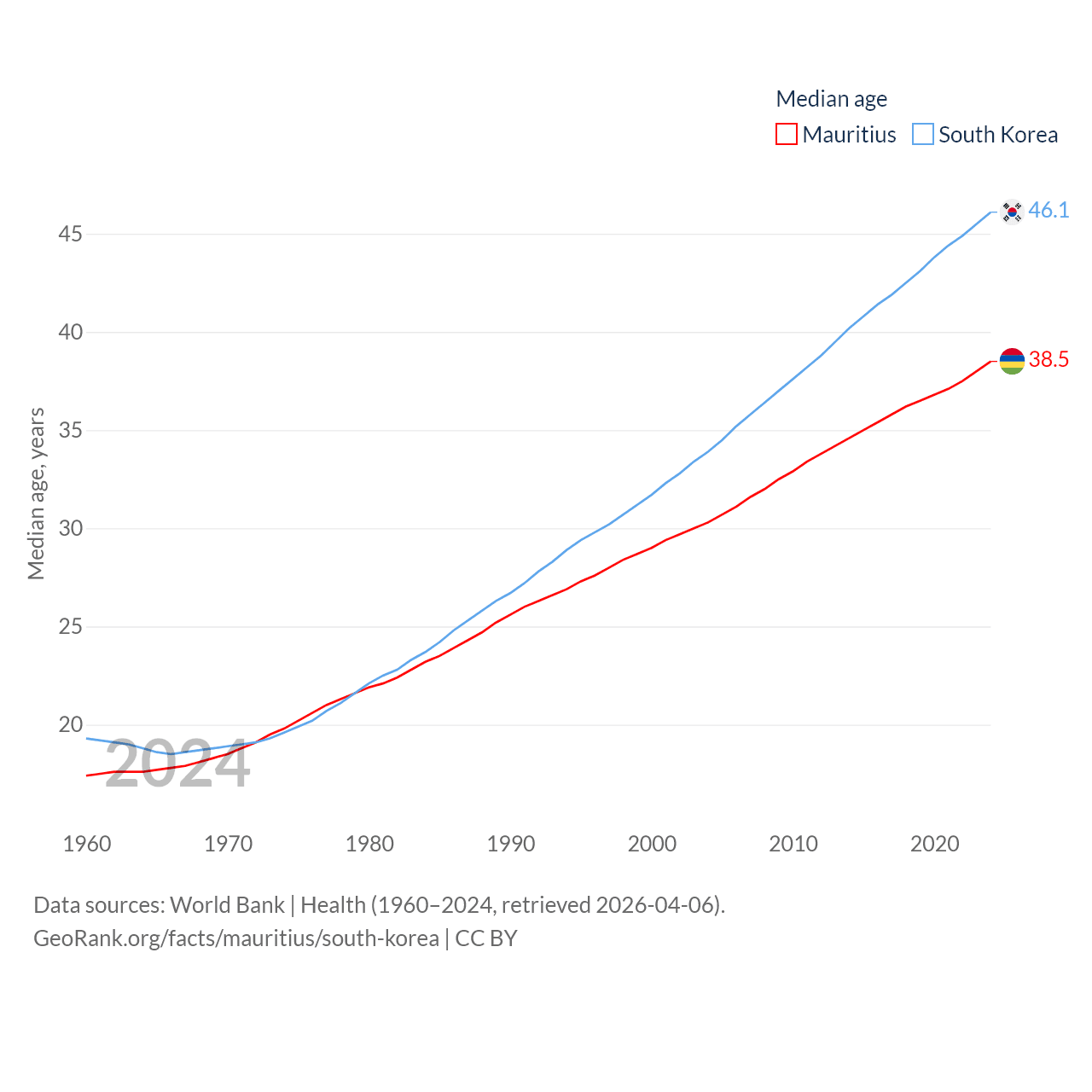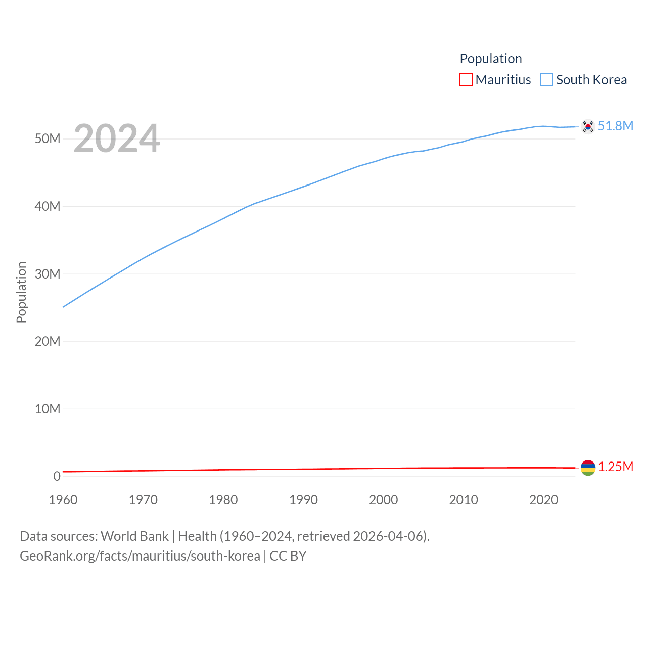 Mauritius has a population of 1.25M (ranked 156/197), compared with 51.8M in South Korea (ranked 29/197). Mauritius' land area is 771 sq mi versus 37,684 sq mi for South Korea (ranked 170th vs. 105th).