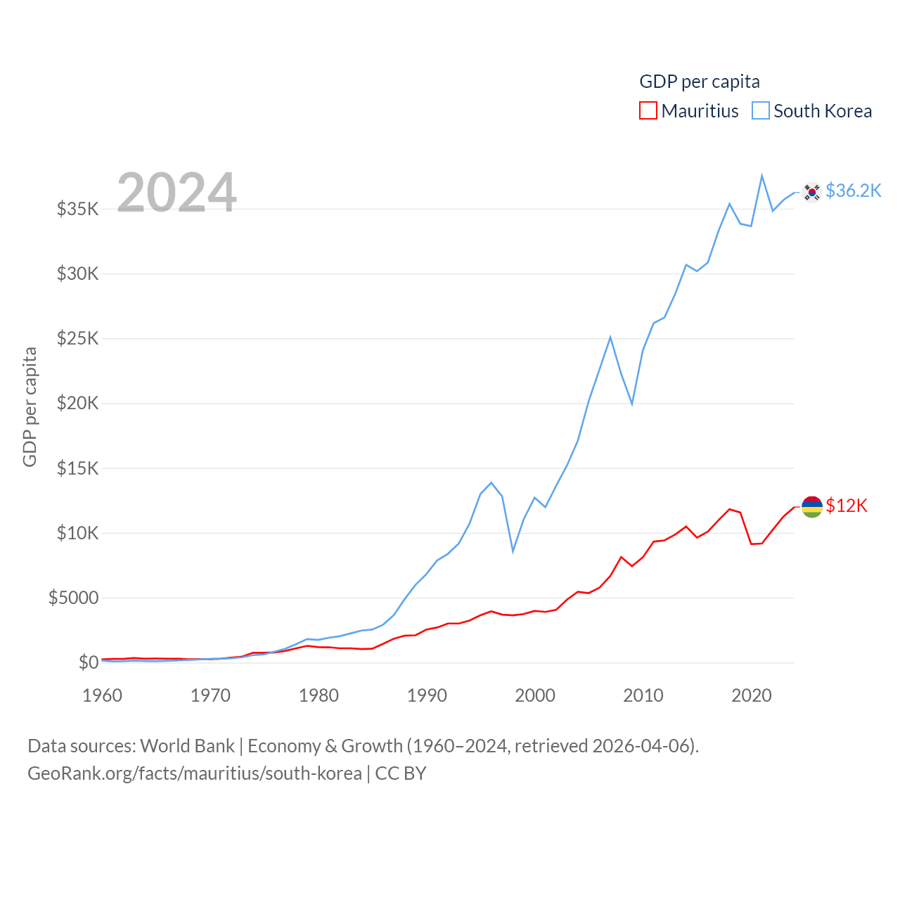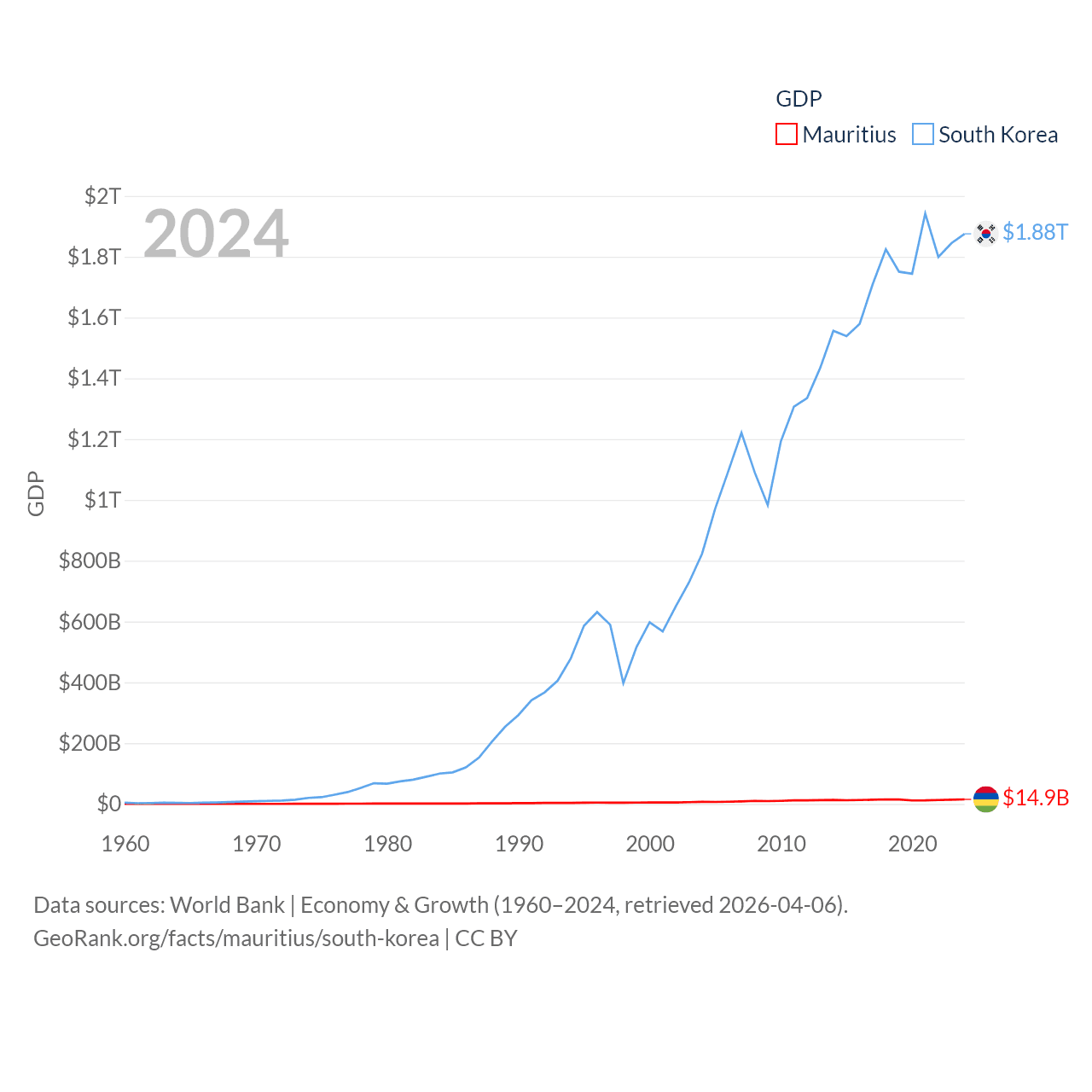 By GDP, Mauritius ranks 143/197 ($14.9B) and South Korea ranks 12/197 ($1.88T). By GDP per capita, Mauritius ranks 78/197 ($11,991), while South Korea ranks 31/197 ($36,239).