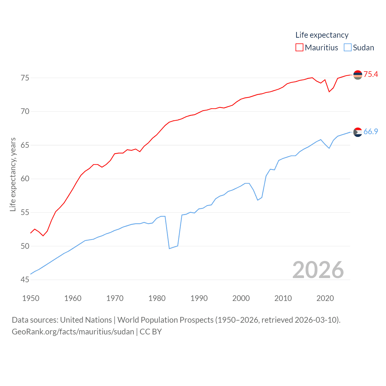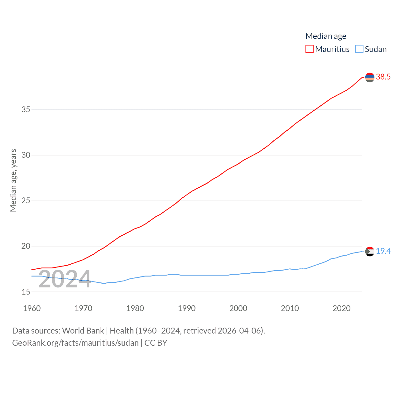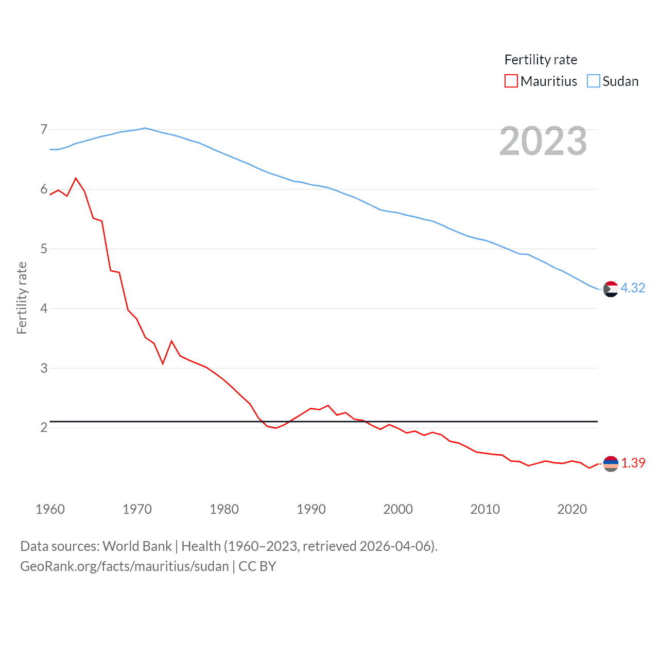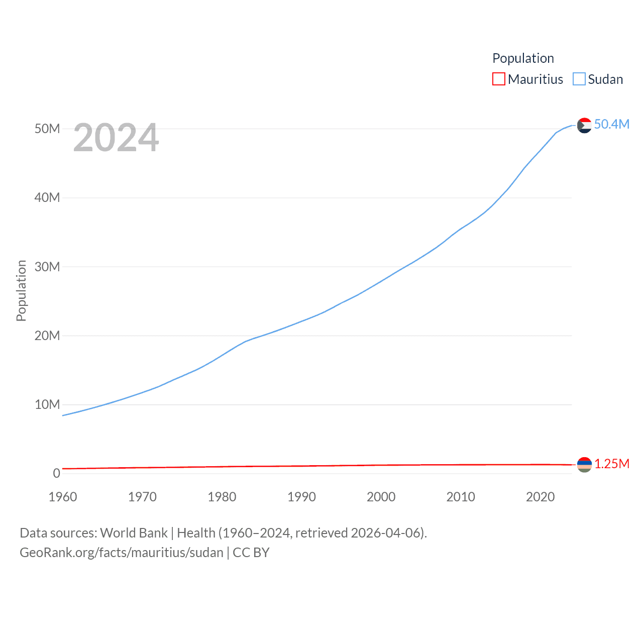 Mauritius has a population of 1.25M (ranked 156/197), compared with 50.4M in Sudan (ranked 30/197). Mauritius' land area is 771 sq mi versus 721,239 sq mi for Sudan (ranked 170th vs. 15th).