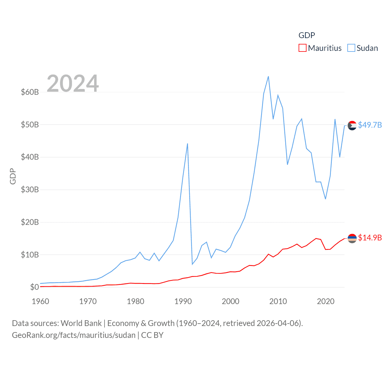 By GDP, Mauritius ranks 143/197 ($14.9B) and Sudan ranks 94/197 ($49.7B). By GDP per capita, Mauritius ranks 78/197 ($11,991), while Sudan ranks 179/197 ($985).