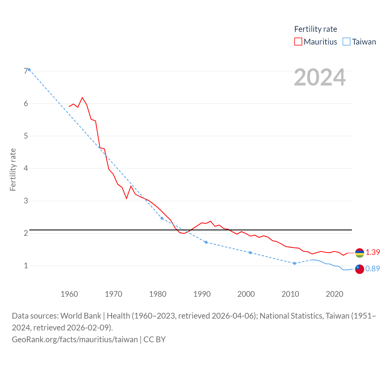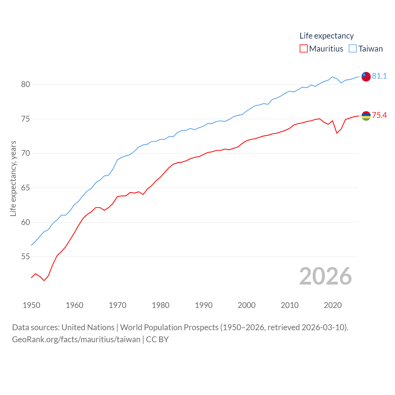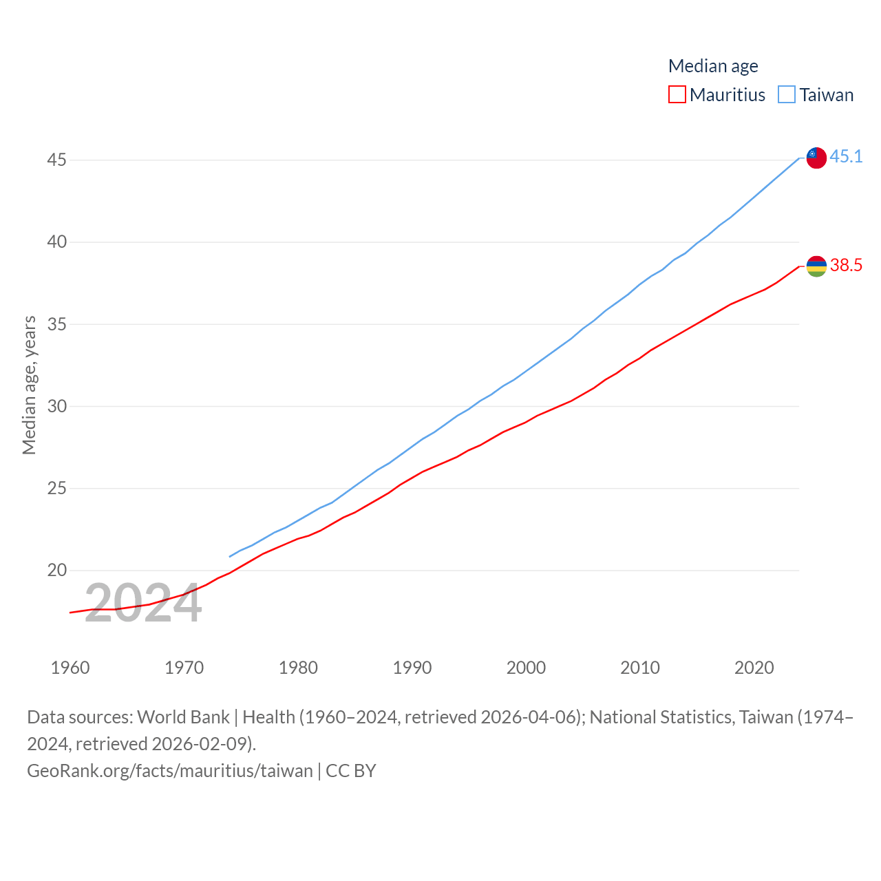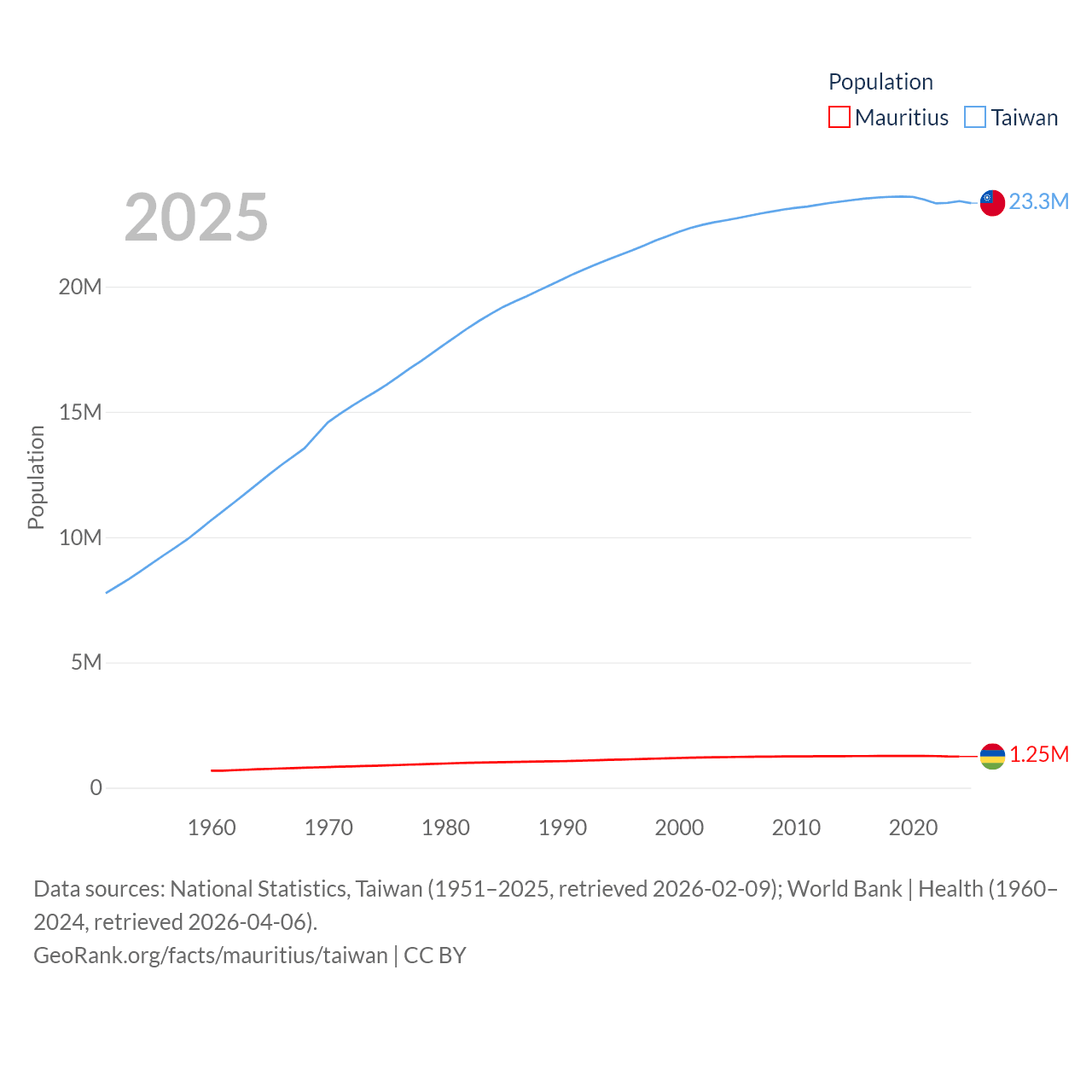 Mauritius has a population of 1.25M (ranked 156/197), compared with 23.3M in Taiwan (ranked 60/197). Mauritius' land area is 771 sq mi versus 13,976 sq mi for Taiwan (ranked 170th vs. 133rd).
