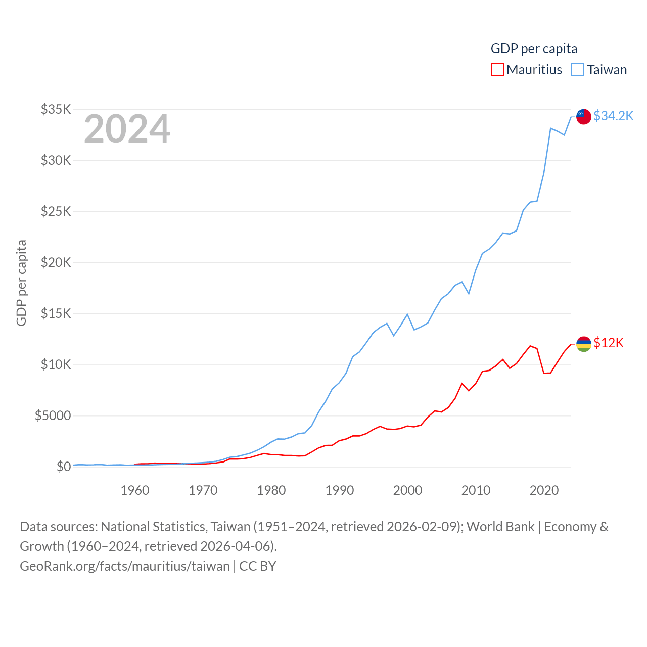 By GDP, Mauritius ranks 143/197 ($14.9B) and Taiwan ranks 22/197 ($802B). By GDP per capita, Mauritius ranks 78/197 ($11,991), while Taiwan ranks 35/197 ($34,238).