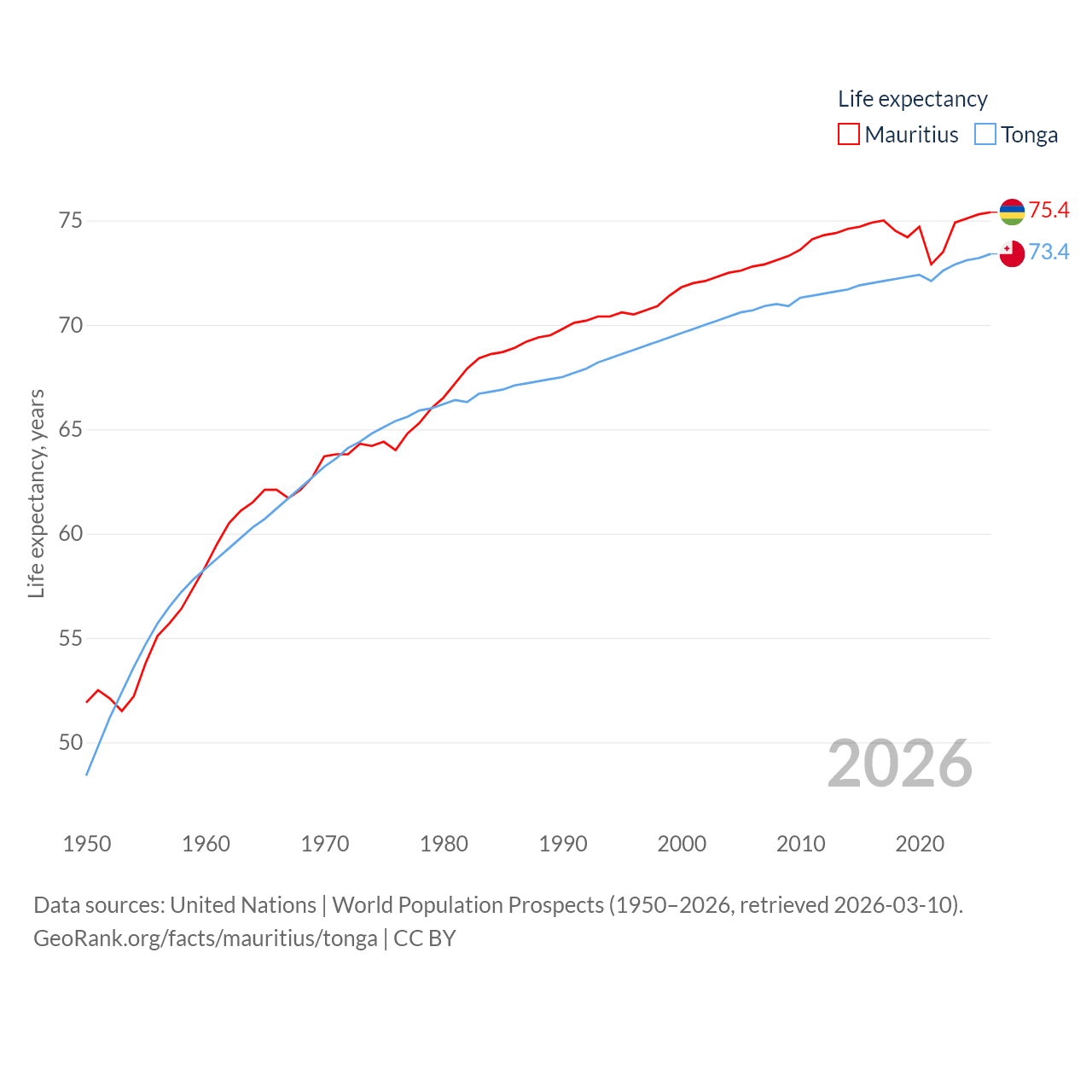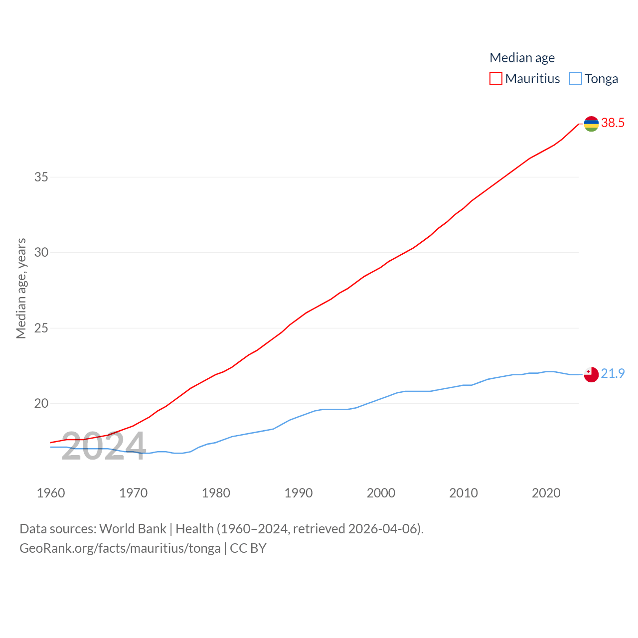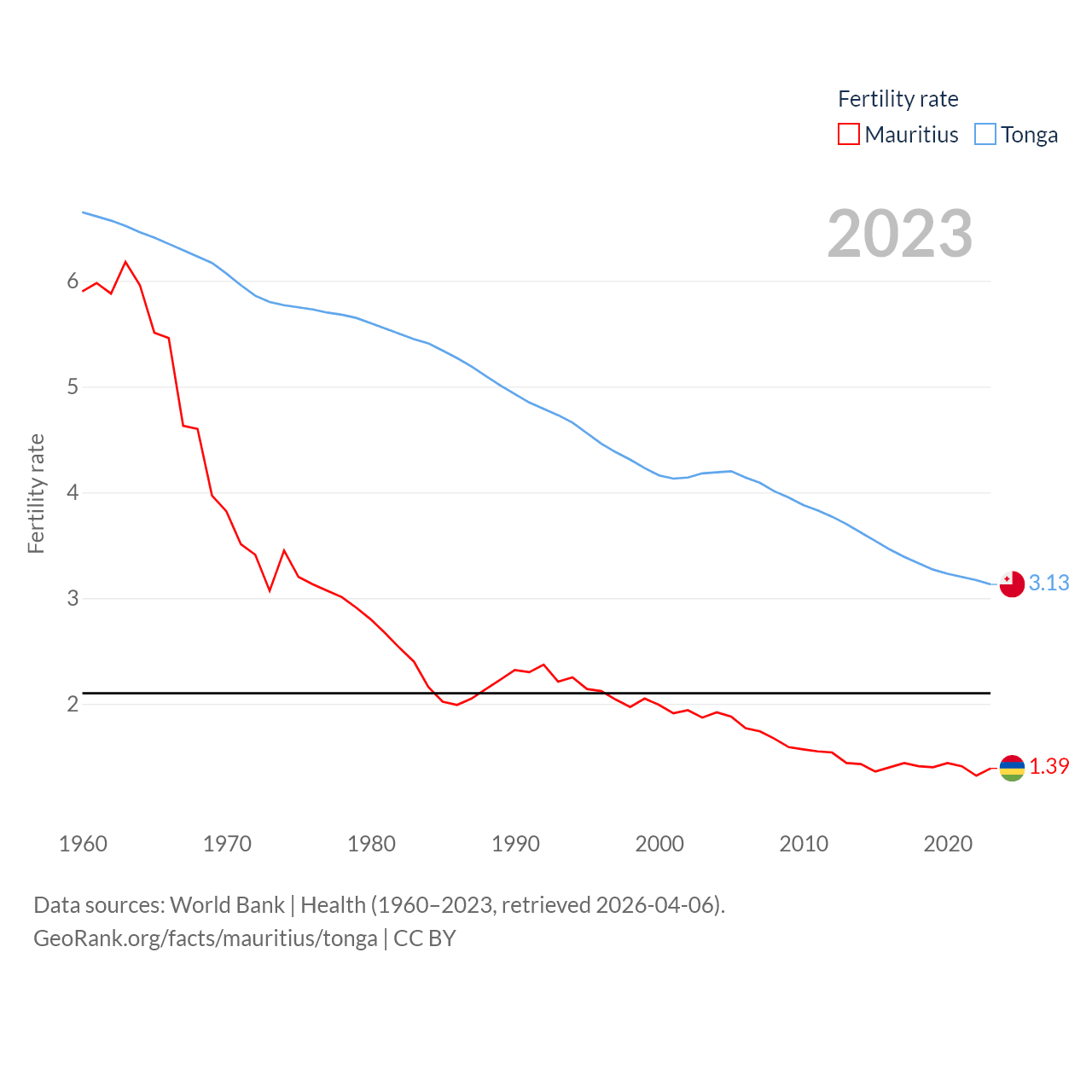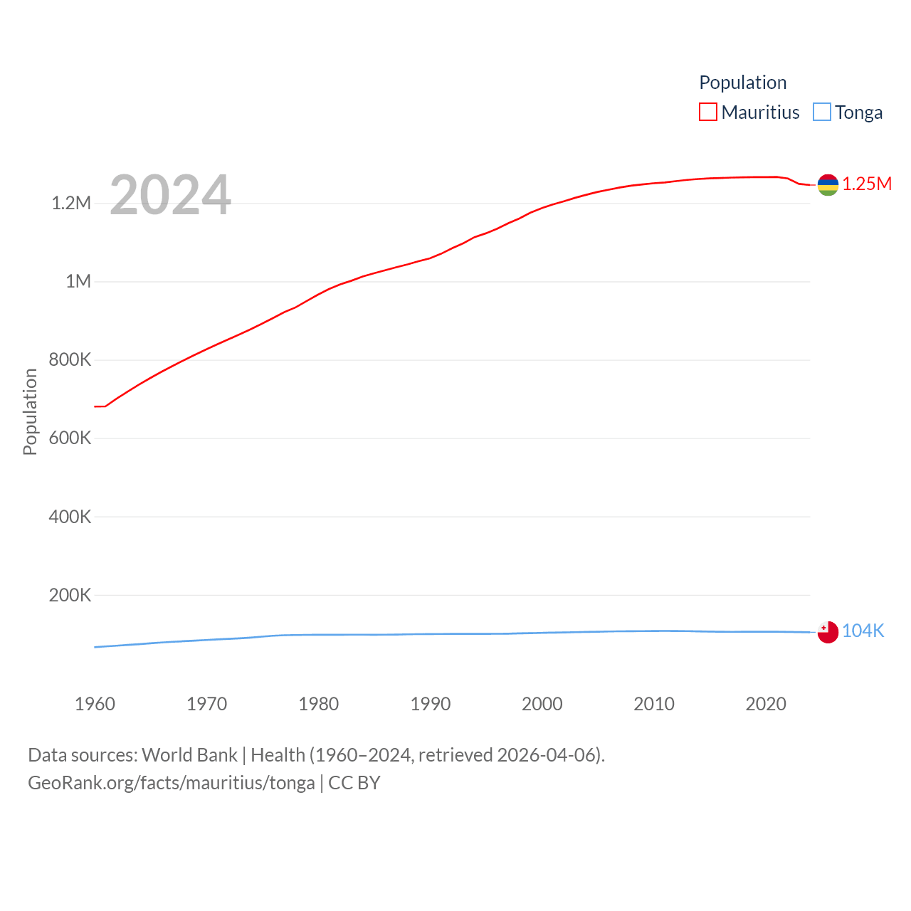 Mauritius has a population of 1.25M (ranked 156/197), compared with 104K in Tonga (ranked 183/197). Mauritius' land area is 771 sq mi versus 278 sq mi for Tonga (ranked 170th vs. 176th).