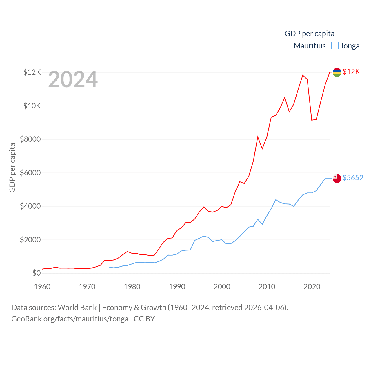 By GDP, Mauritius ranks 143/197 ($14.9B) and Tonga ranks 191/197 ($591M). By GDP per capita, Mauritius ranks 78/197 ($11,991), while Tonga ranks 115/197 ($5,652).