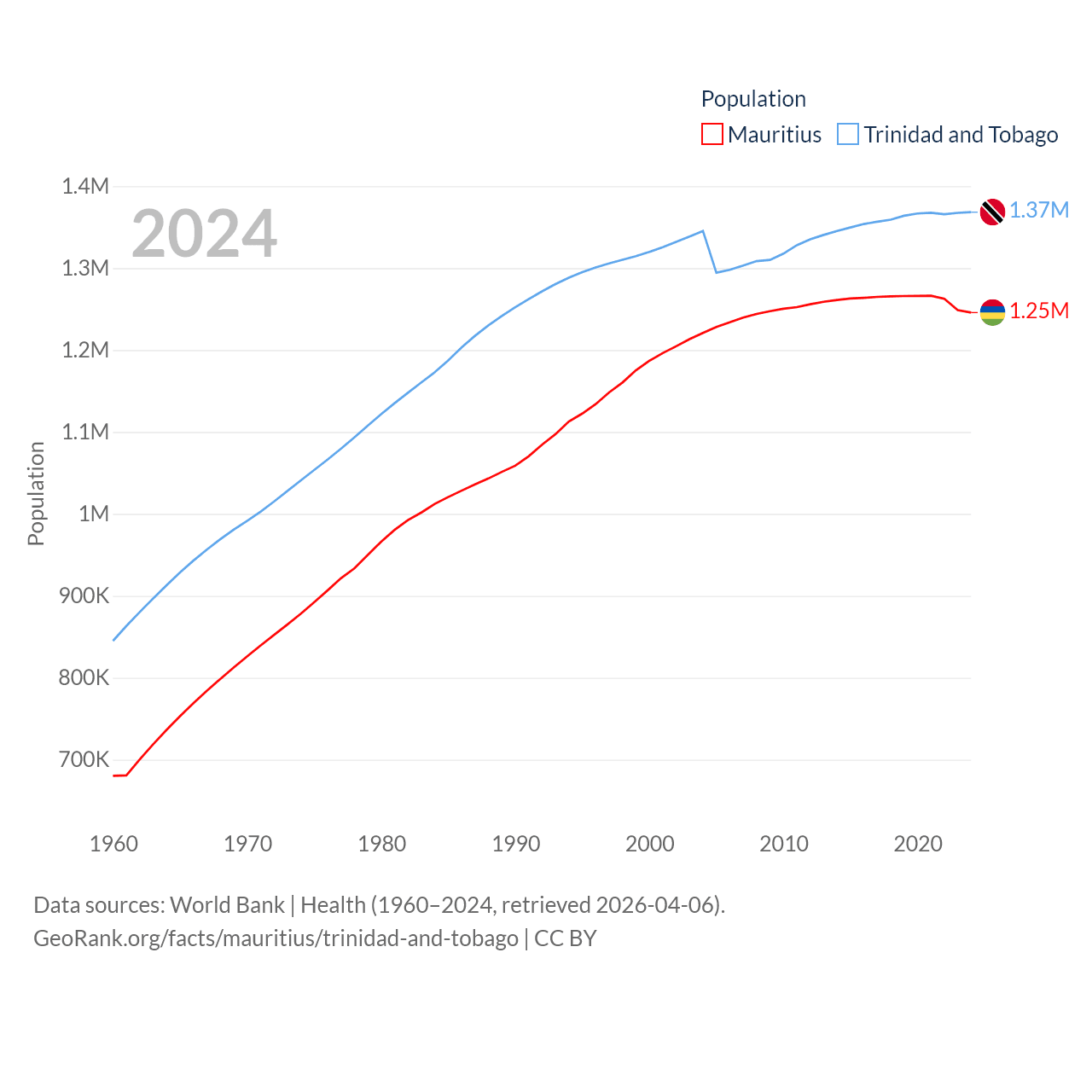 Mauritius has a population of 1.25M (ranked 156/197), compared with 1.37M in Trinidad and Tobago (ranked 154/197). Mauritius' land area is 771 sq mi versus 1,981 sq mi for Trinidad and Tobago (ranked 170th vs. 166th).