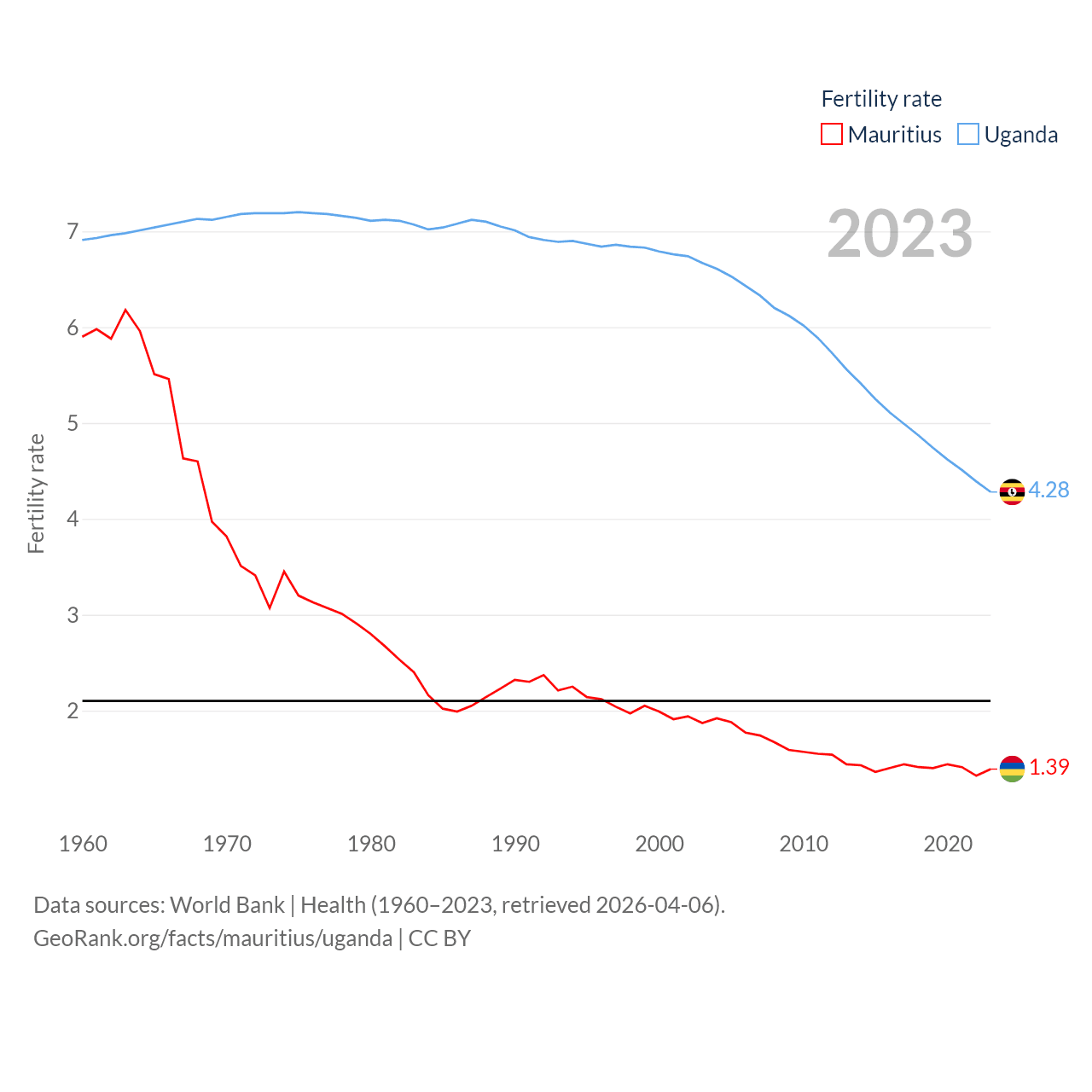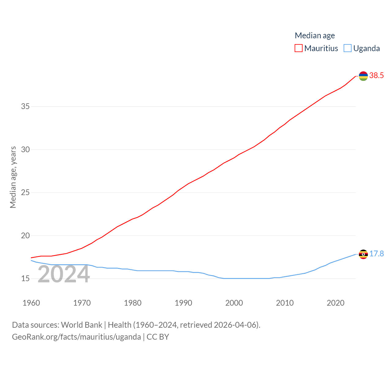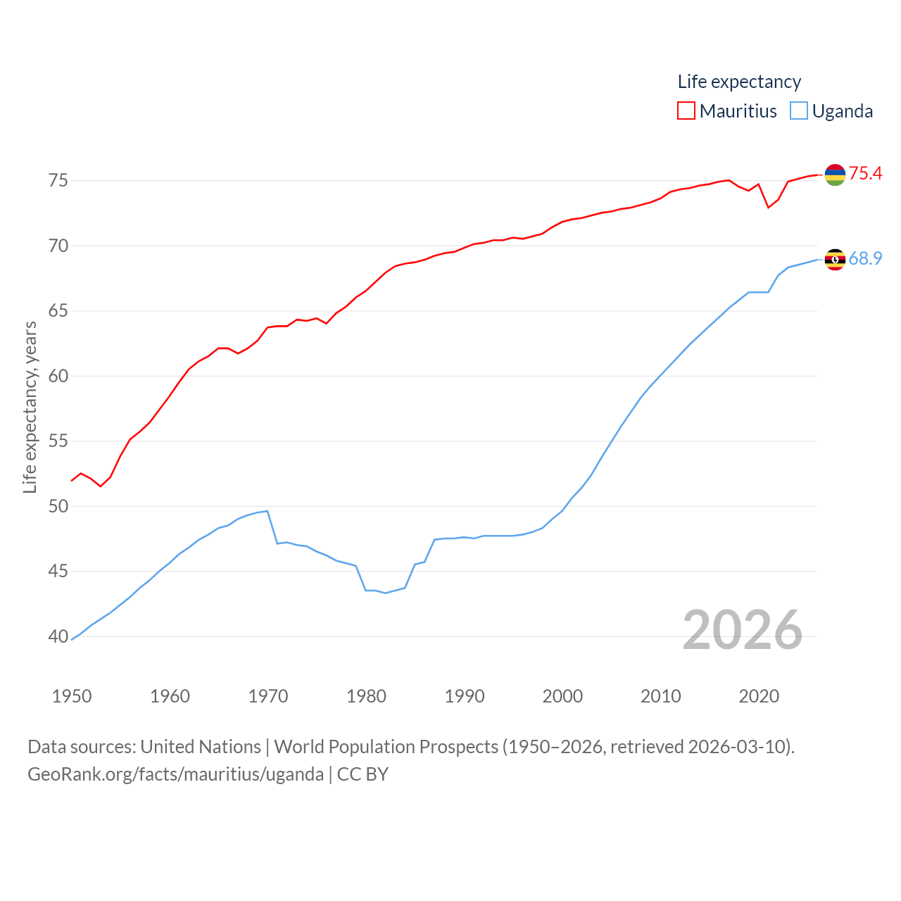 Mauritius has a population of 1.25M (ranked 156/197), compared with 50M in Uganda (ranked 31/197). Mauritius' land area is 771 sq mi versus 77,421 sq mi for Uganda (ranked 170th vs. 84th).