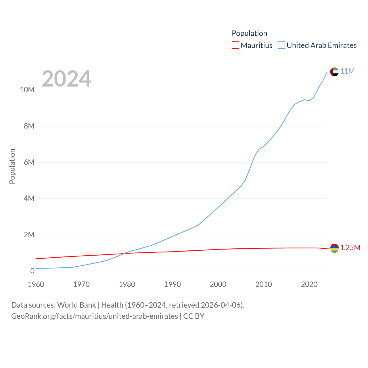 Mauritius has a population of 1.25M (ranked 156/197), compared with 11M in The United Arab Emirates (ranked 86/197). Mauritius' land area is 771 sq mi versus 27,421 sq mi for The United Arab Emirates (ranked 170th vs. 117th).