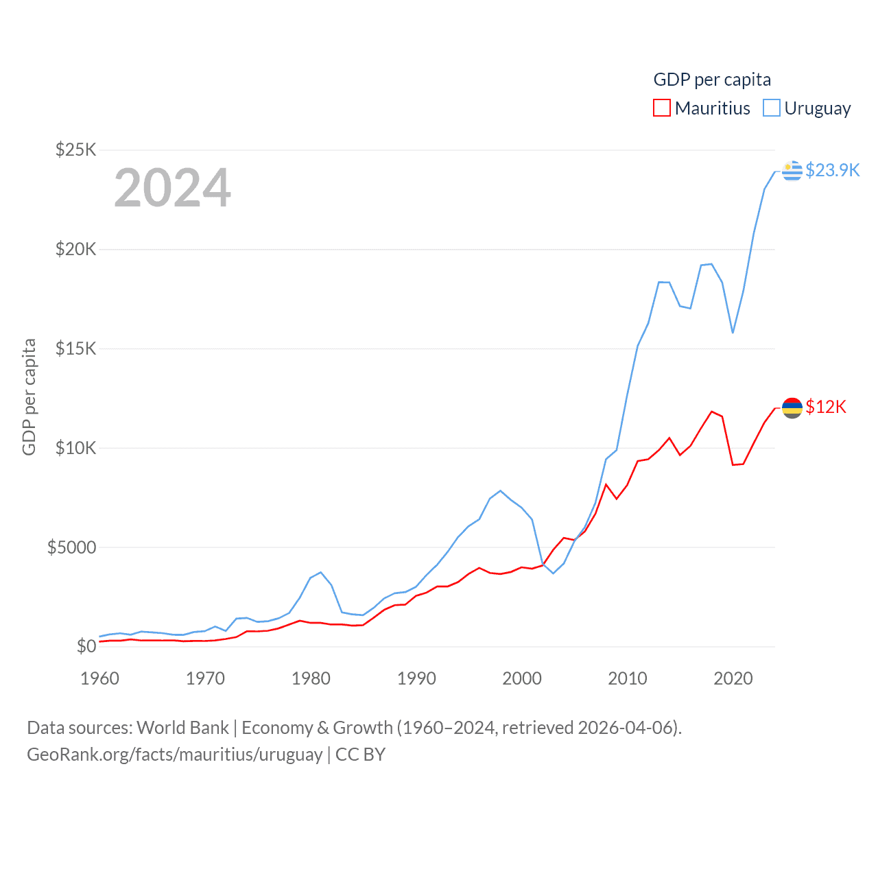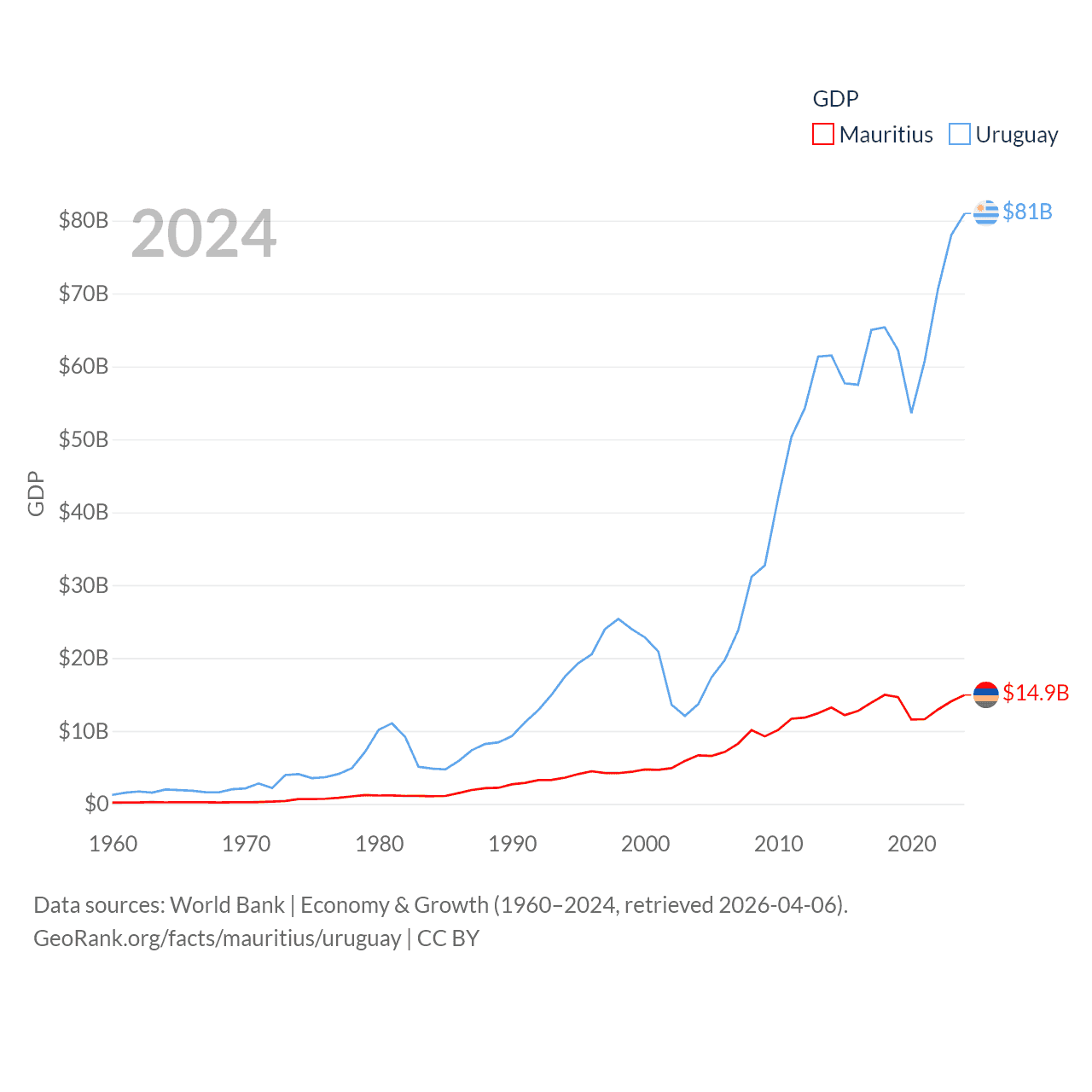 By GDP, Mauritius ranks 143/197 ($14.9B) and Uruguay ranks 81/197 ($81B). By GDP per capita, Mauritius ranks 78/197 ($11,991), while Uruguay ranks 52/197 ($23,907).