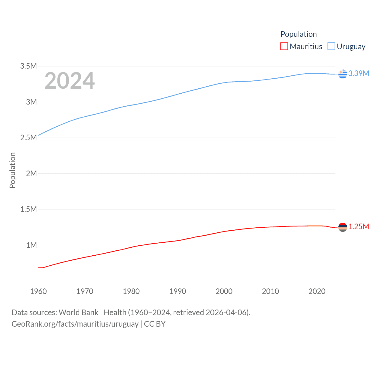 Mauritius has a population of 1.25M (ranked 156/197), compared with 3.39M in Uruguay (ranked 133/197). Mauritius' land area is 771 sq mi versus 67,576 sq mi for Uruguay (ranked 170th vs. 89th).
