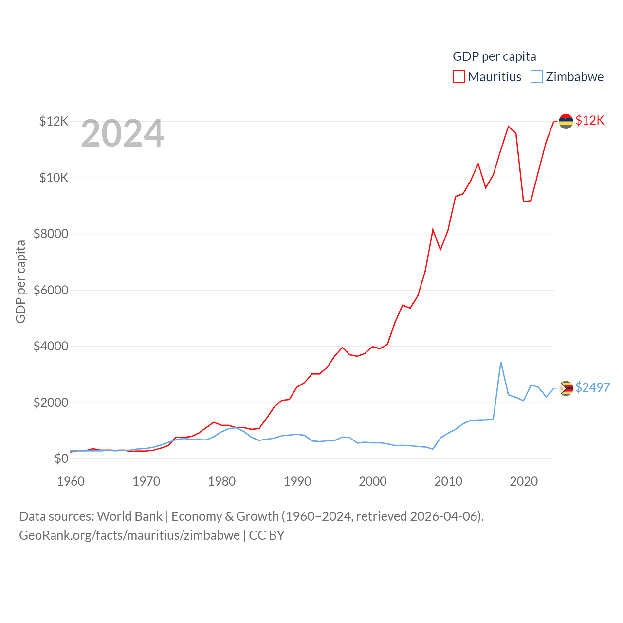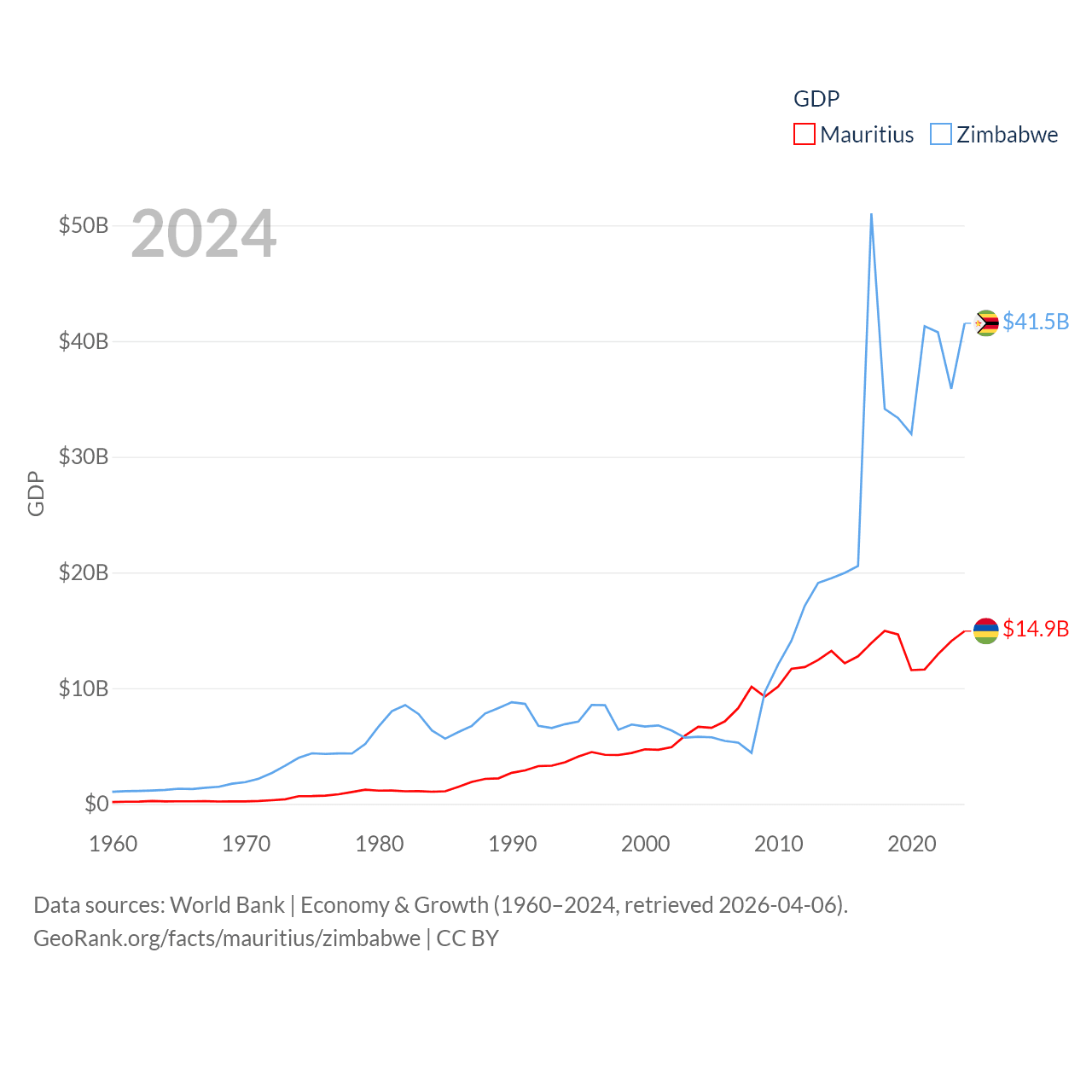 By GDP, Mauritius ranks 143/197 ($14.9B) and Zimbabwe ranks 102/197 ($41.5B). By GDP per capita, Mauritius ranks 78/197 ($11,991), while Zimbabwe ranks 148/197 ($2,497).