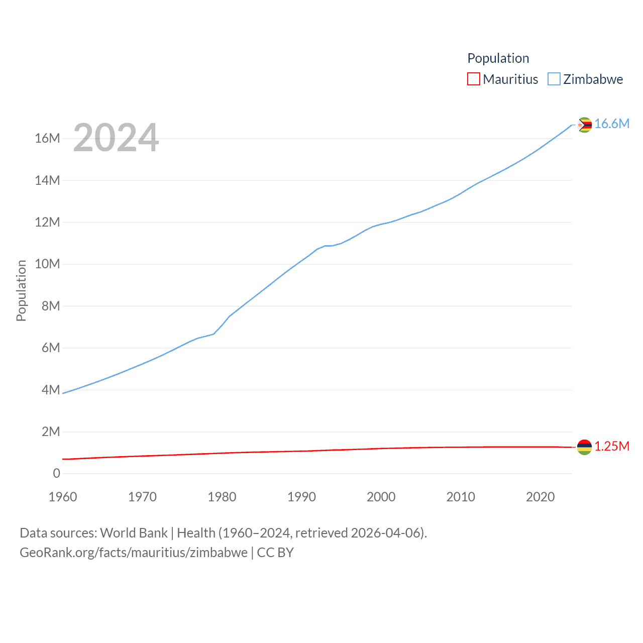 Mauritius has a population of 1.25M (ranked 156/197), compared with 16.6M in Zimbabwe (ranked 74/197). Mauritius' land area is 771 sq mi versus 149,364 sq mi for Zimbabwe (ranked 170th vs. 60th).