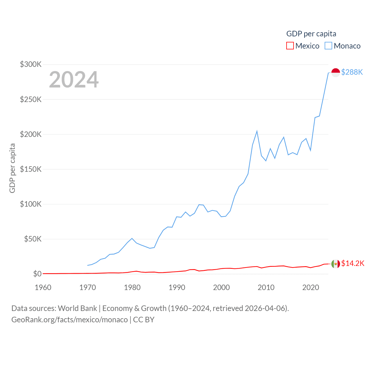 By GDP, Mexico ranks 13/197 ($1.86T) and Monaco ranks 152/197 ($11.1B). By GDP per capita, Mexico ranks 69/197 ($14,186), while Monaco ranks 1/197 ($288,001).