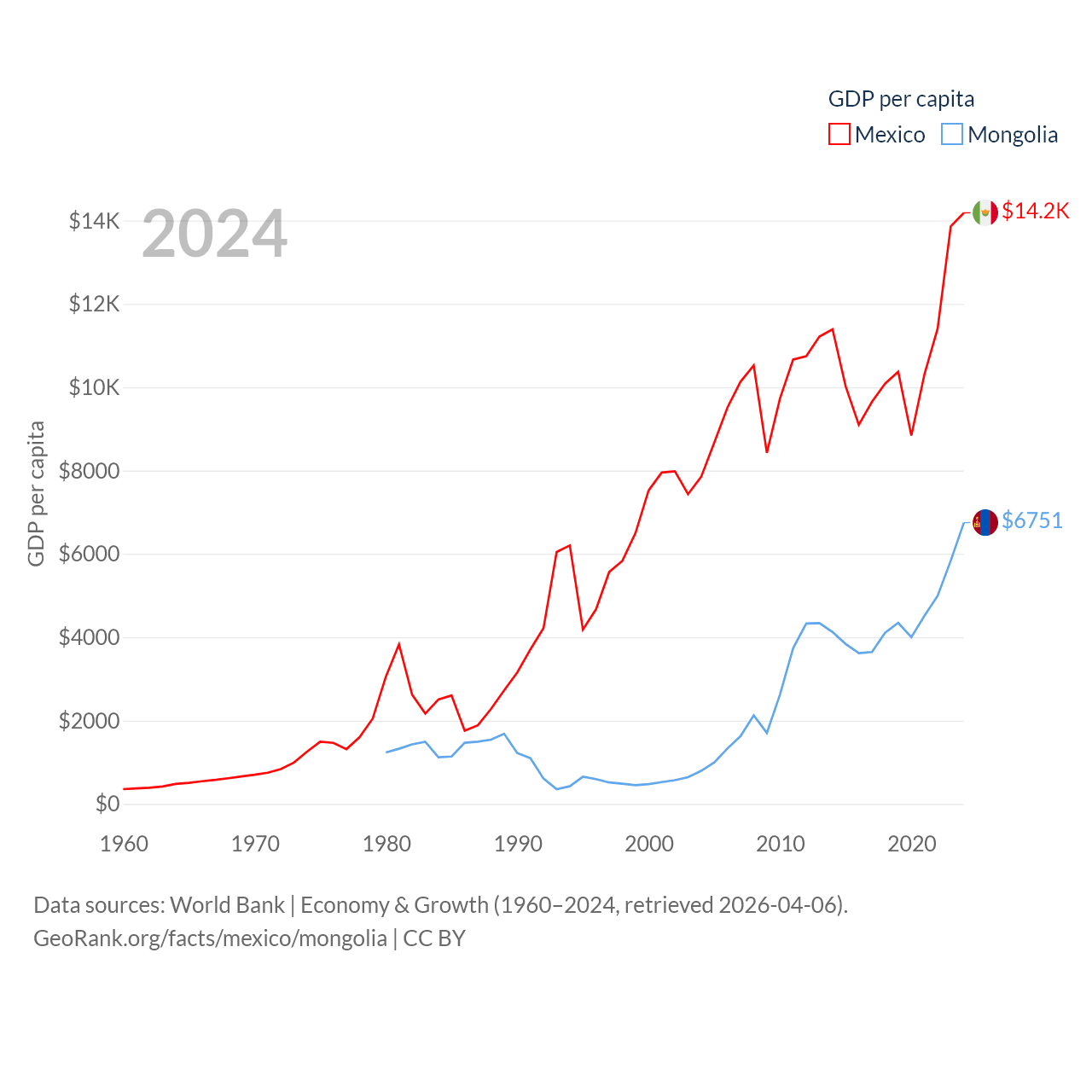 By GDP, Mexico ranks 13/197 ($1.86T) and Mongolia ranks 121/197 ($23.8B). By GDP per capita, Mexico ranks 69/197 ($14,186), while Mongolia ranks 105/197 ($6,751).
