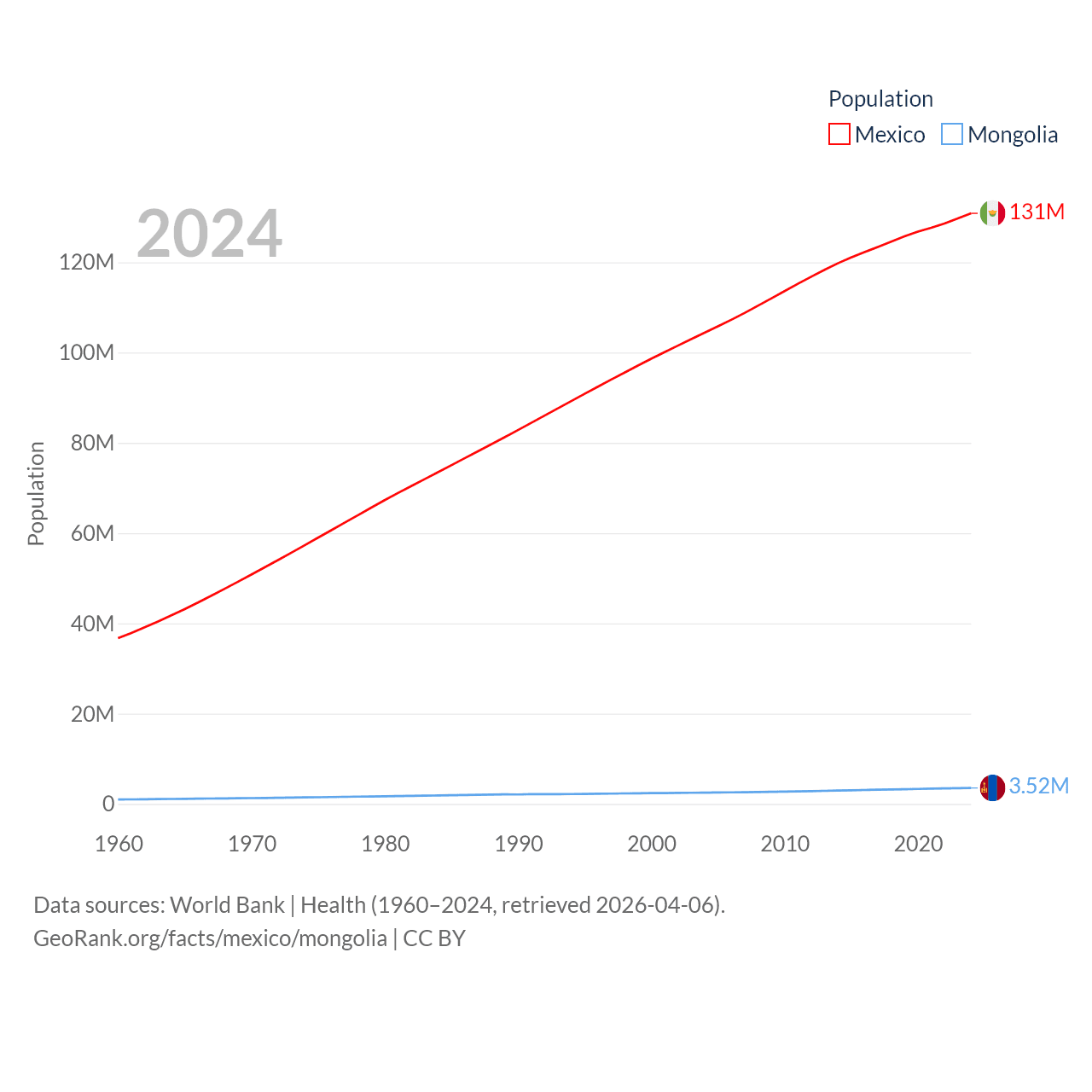 Mexico has a population of 131M (ranked 11/197), compared with 3.52M in Mongolia (ranked 132/197). Mexico's land area is 750,563 sq mi versus 601,740 sq mi for Mongolia (ranked 13th vs. 18th).