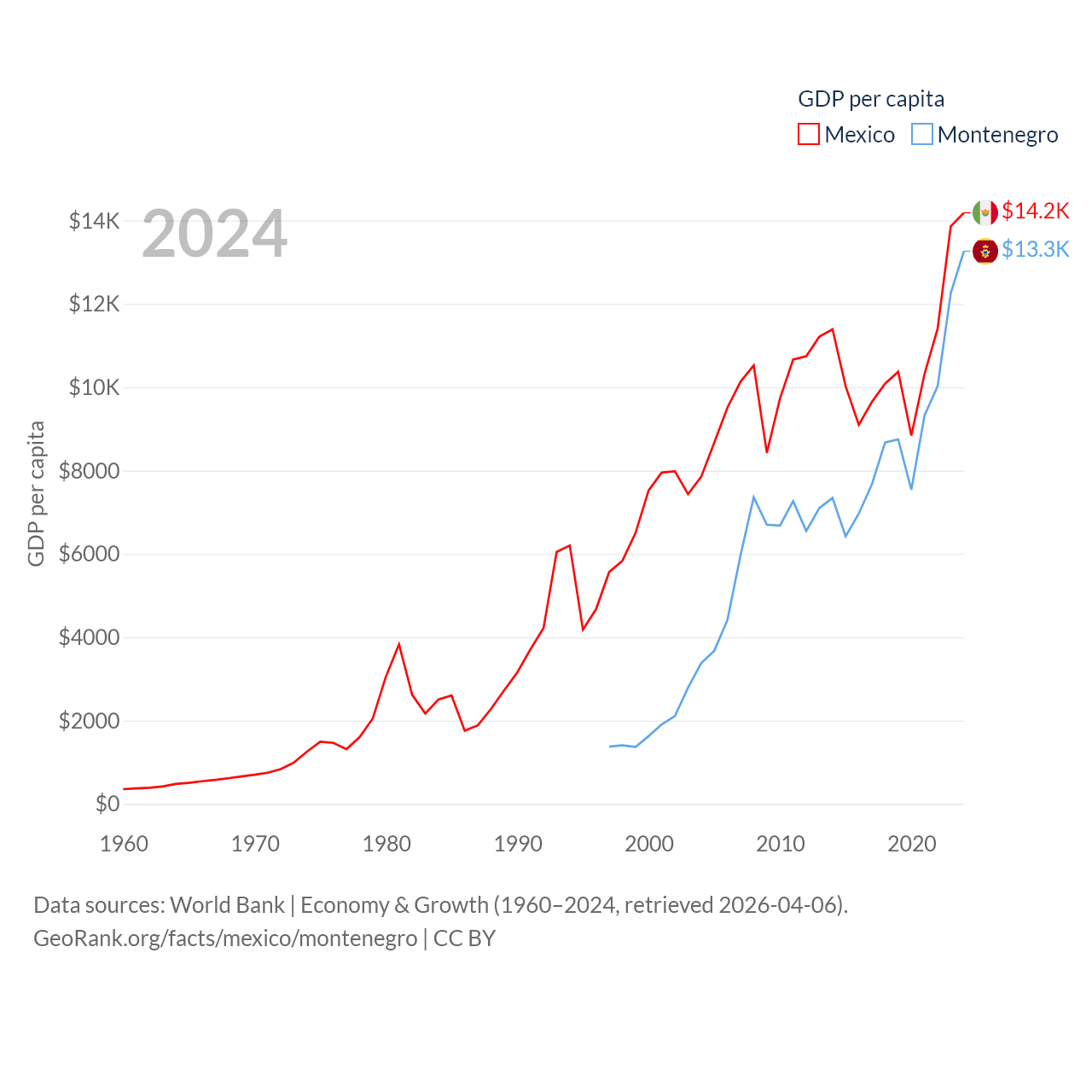 By GDP, Mexico ranks 13/197 ($1.86T) and Montenegro ranks 155/197 ($8.27B). By GDP per capita, Mexico ranks 69/197 ($14,186), while Montenegro ranks 77/197 ($13,263).