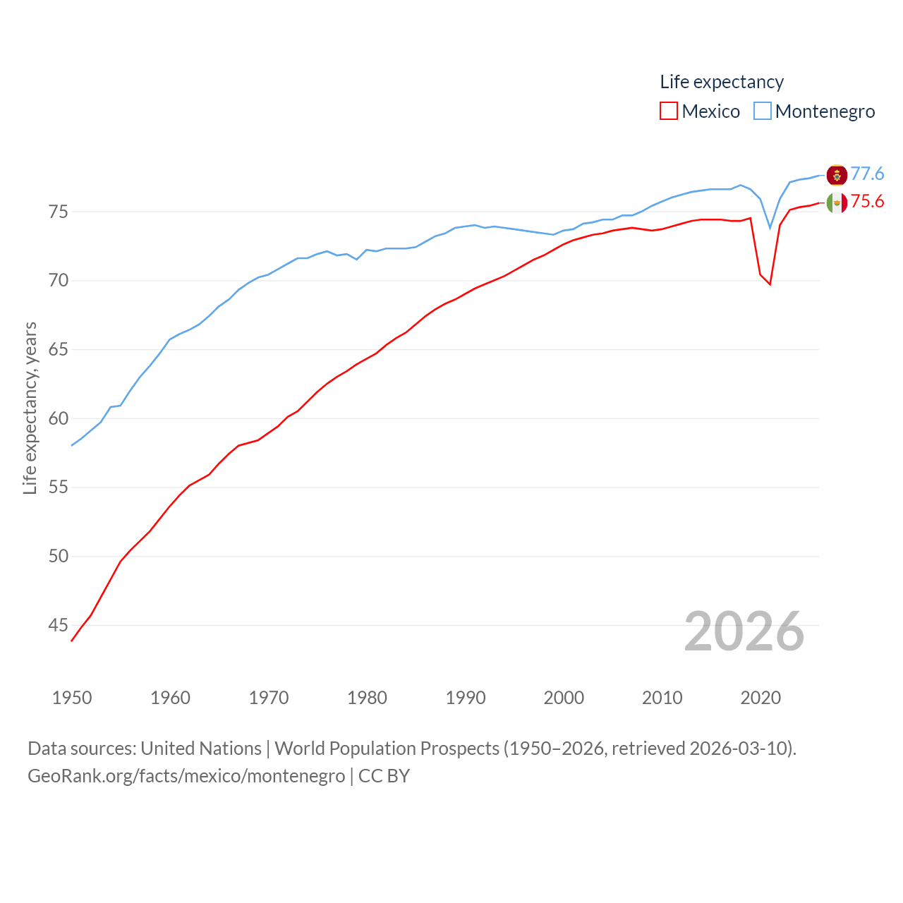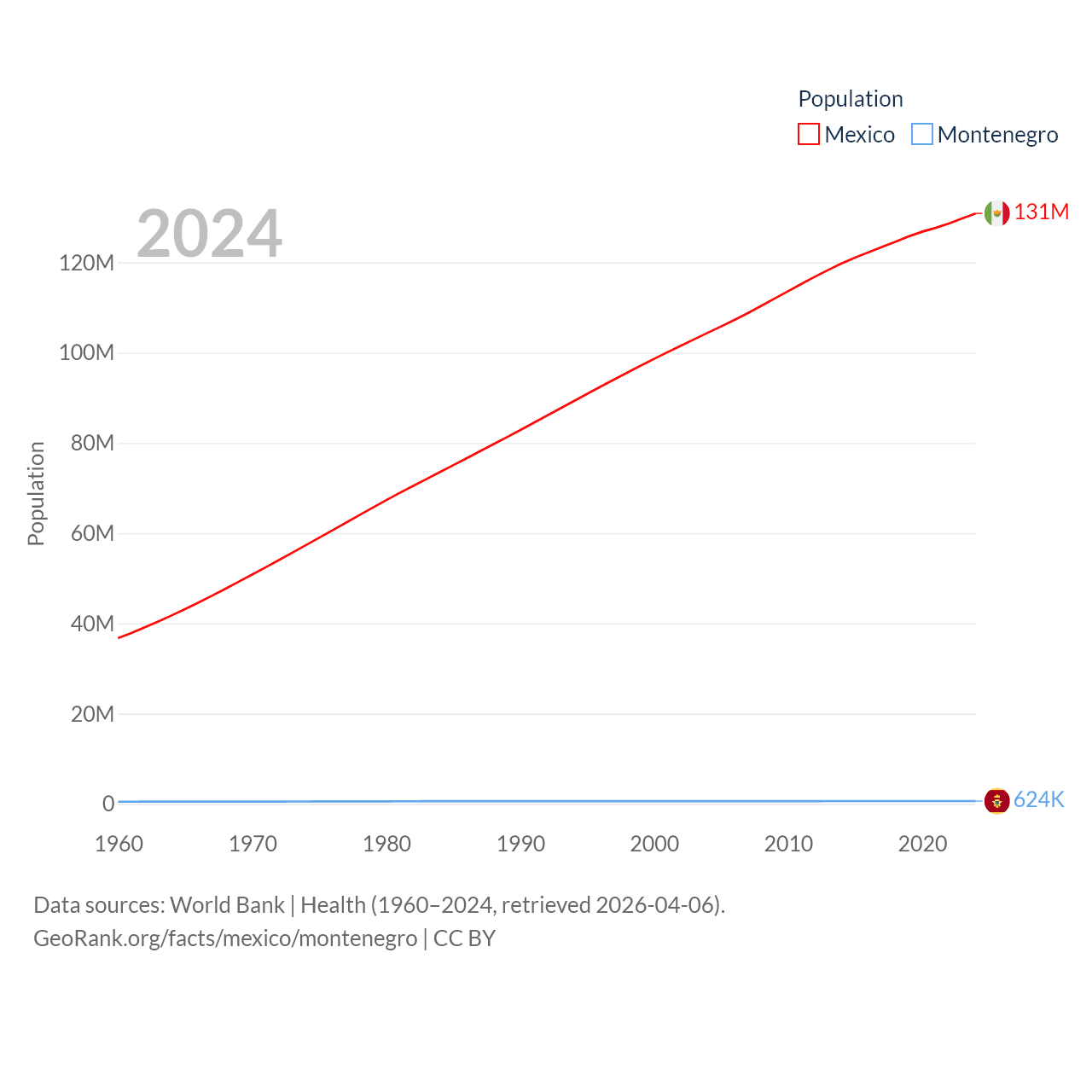 Mexico has a population of 131M (ranked 11/197), compared with 624K in Montenegro (ranked 166/197). Mexico's land area is 750,563 sq mi versus 5,193 sq mi for Montenegro (ranked 13th vs. 156th).