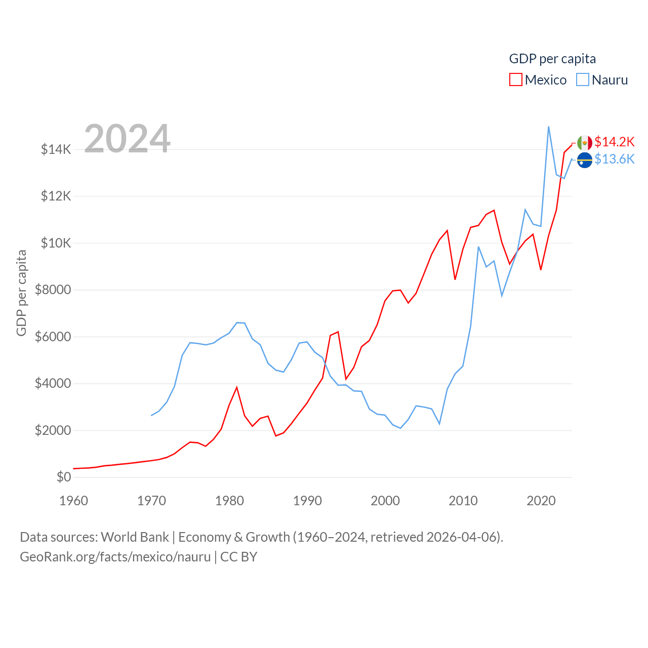 By GDP, Mexico ranks 13/197 ($1.86T) and Nauru ranks 195/197 ($163M). By GDP per capita, Mexico ranks 69/197 ($14,186), while Nauru ranks 74/197 ($13,609).