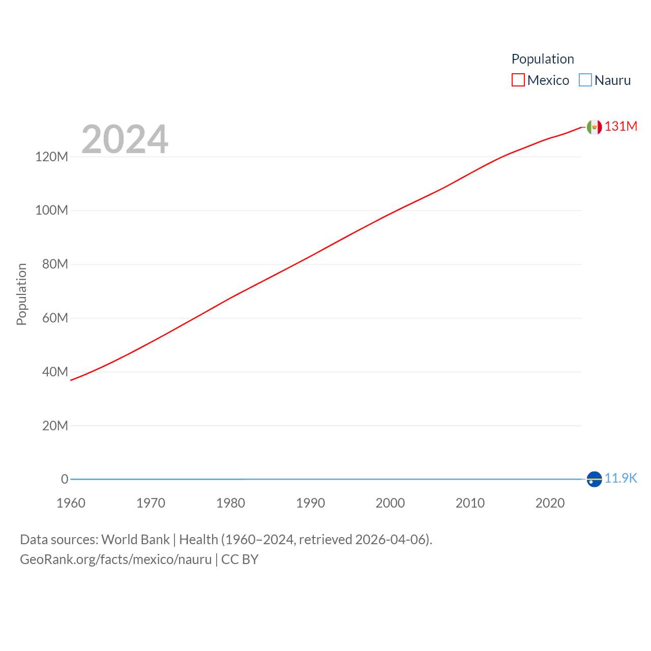 Mexico has a population of 131M (ranked 11/197), compared with 11.9K in Nauru (ranked 195/197). Mexico's land area is 750,563 sq mi versus 7.72 sq mi for Nauru (ranked 13th vs. 195th).