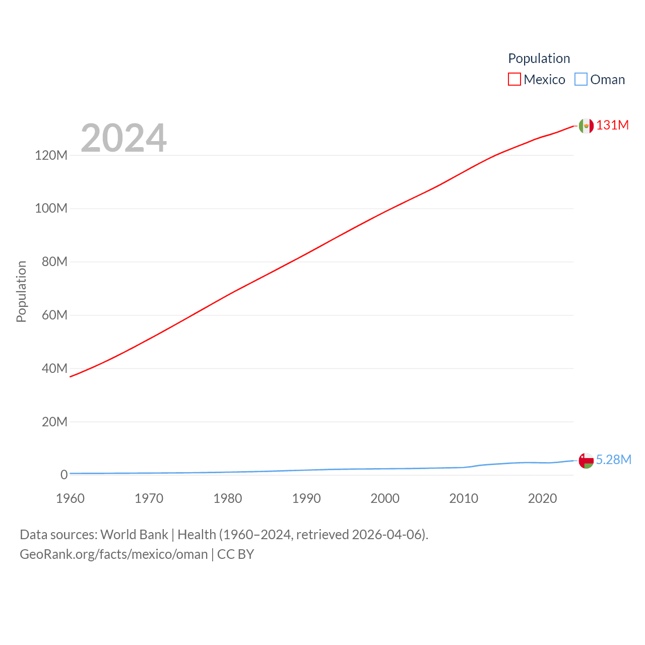 Mexico has a population of 131M (ranked 11/197), compared with 5.28M in Oman (ranked 124/197). Mexico's land area is 750,563 sq mi versus 119,499 sq mi for Oman (ranked 13th vs. 68th).