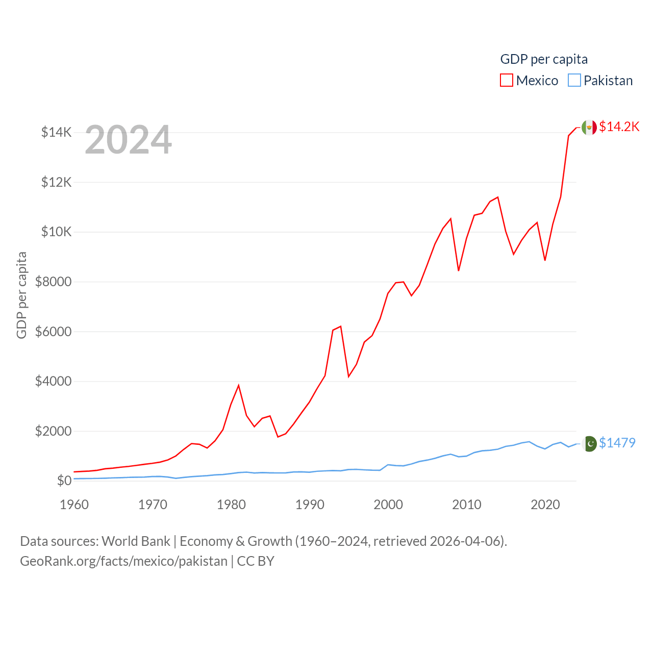 By GDP, Mexico ranks 13/197 ($1.86T) and Pakistan ranks 43/197 ($372B). By GDP per capita, Mexico ranks 69/197 ($14,186), while Pakistan ranks 163/197 ($1,479).