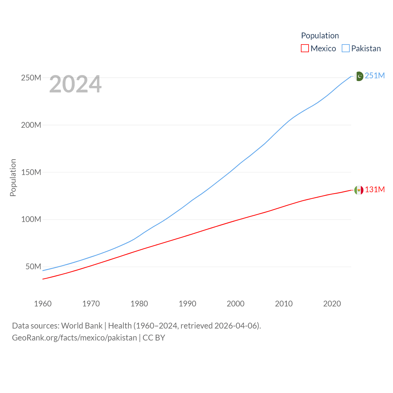 Mexico has a population of 131M (ranked 11/197), compared with 251M in Pakistan (ranked 5/197). Mexico's land area is 750,563 sq mi versus 297,638 sq mi for Pakistan (ranked 13th vs. 35th).