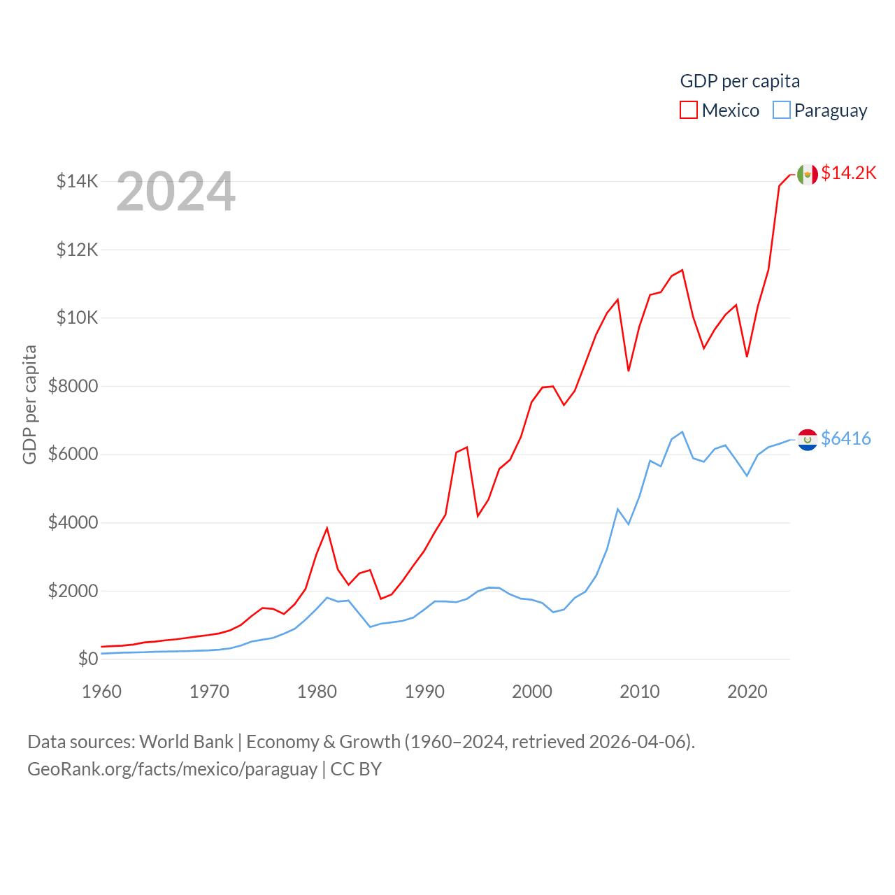 By GDP, Mexico ranks 13/197 ($1.86T) and Paraguay ranks 98/197 ($44.5B). By GDP per capita, Mexico ranks 69/197 ($14,186), while Paraguay ranks 109/197 ($6,416).