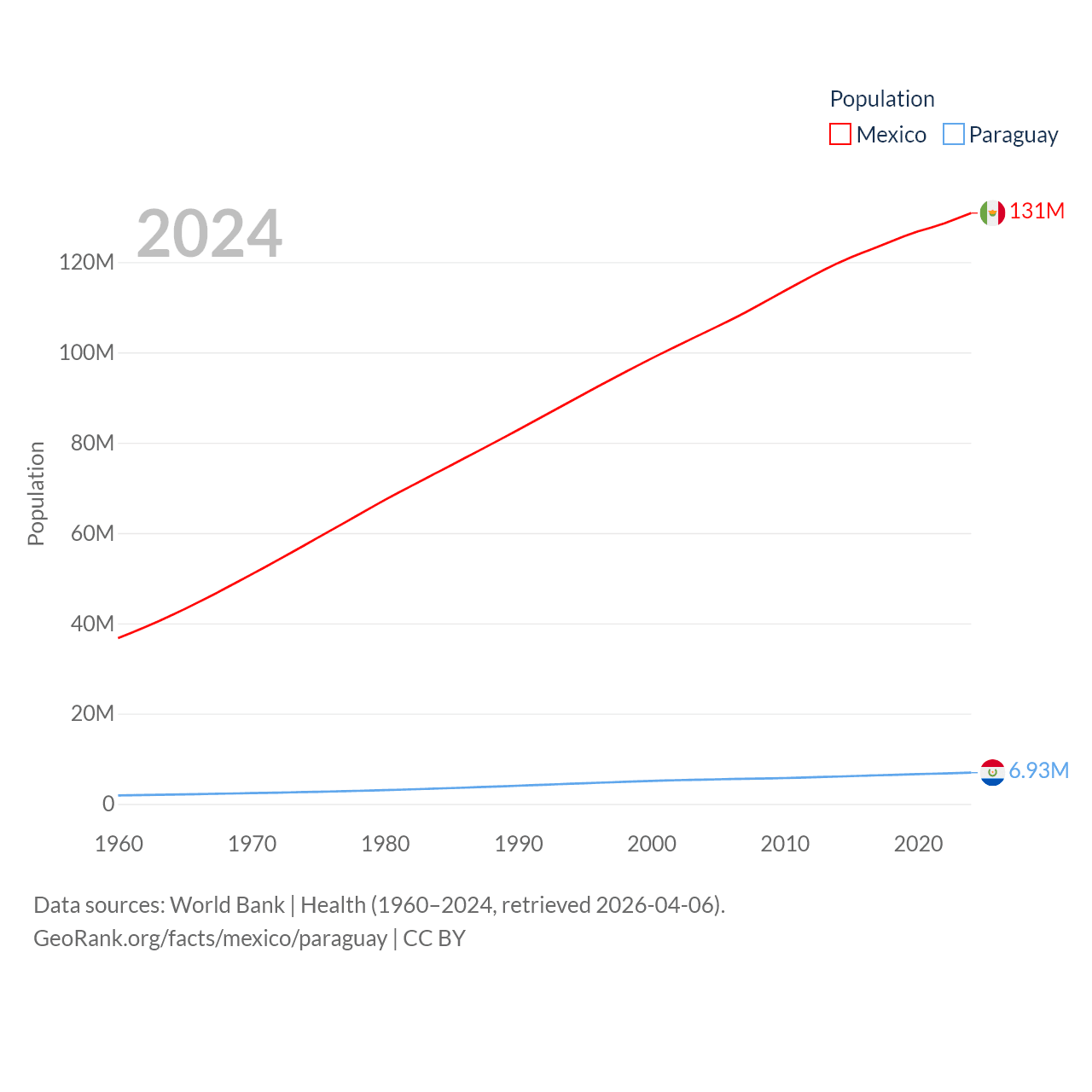 Mexico has a population of 131M (ranked 11/197), compared with 6.93M in Paraguay (ranked 107/197). Mexico's land area is 750,563 sq mi versus 152,901 sq mi for Paraguay (ranked 13th vs. 59th).