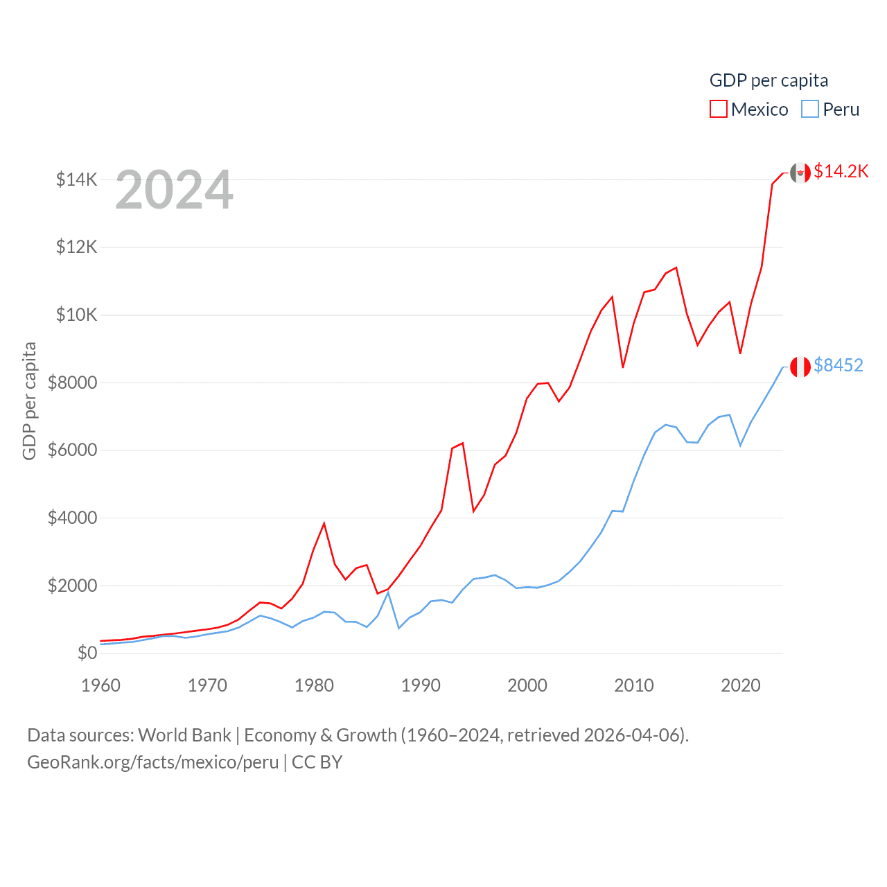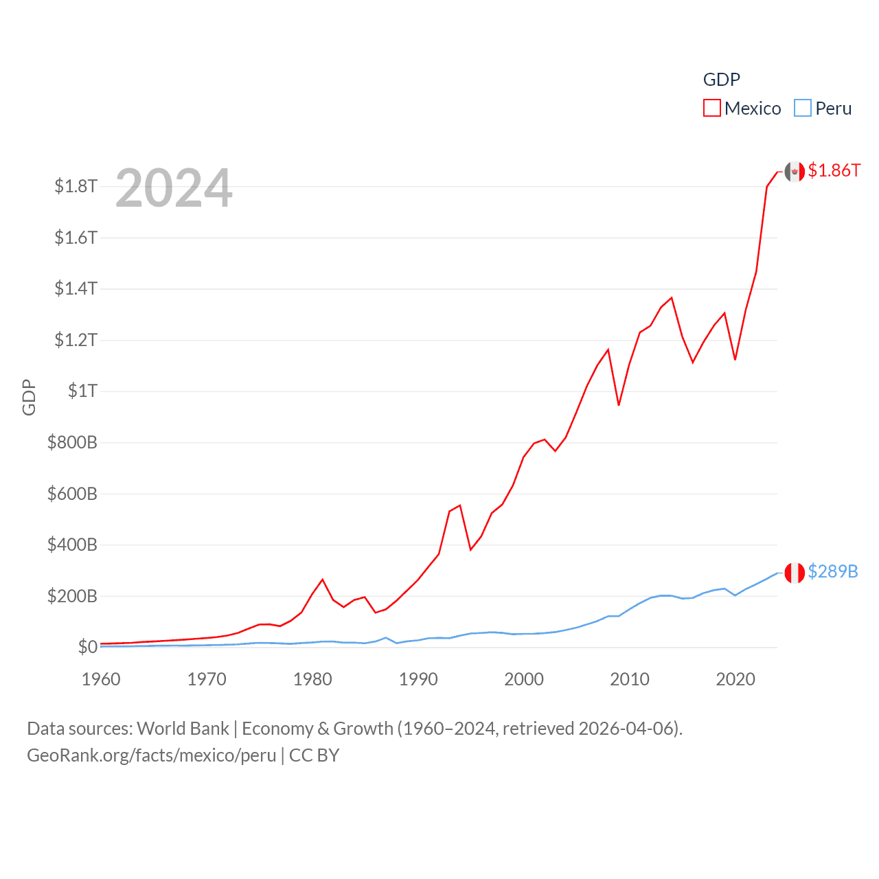 By GDP, Mexico ranks 13/197 ($1.86T) and Peru ranks 49/197 ($289B). By GDP per capita, Mexico ranks 69/197 ($14,186), while Peru ranks 91/197 ($8,452).
