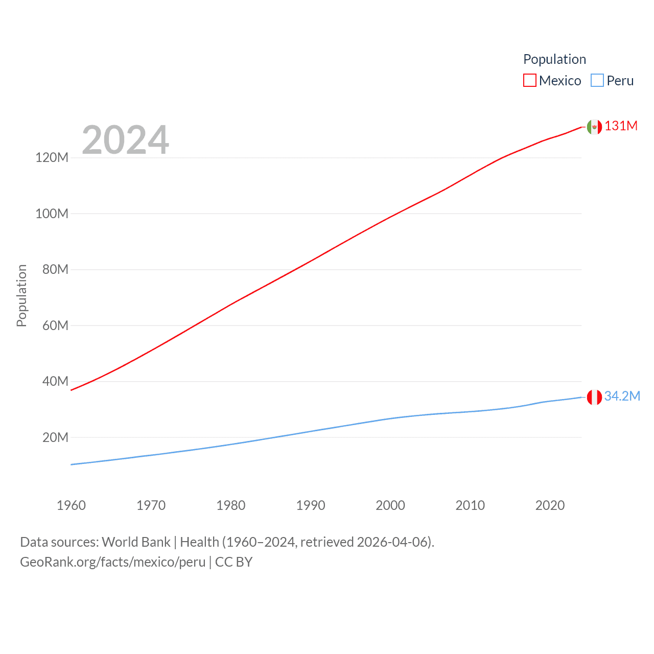 Mexico has a population of 131M (ranked 11/197), compared with 34.2M in Peru (ranked 48/197). Mexico's land area is 750,563 sq mi versus 494,211 sq mi for Peru (ranked 13th vs. 19th).