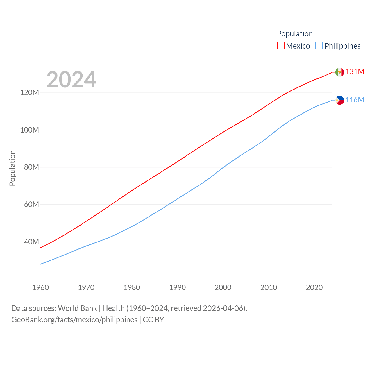 Mexico has a population of 131M (ranked 11/197), compared with 116M in The Philippines (ranked 14/197). Mexico's land area is 750,563 sq mi versus 115,124 sq mi for The Philippines (ranked 13th vs. 71st).