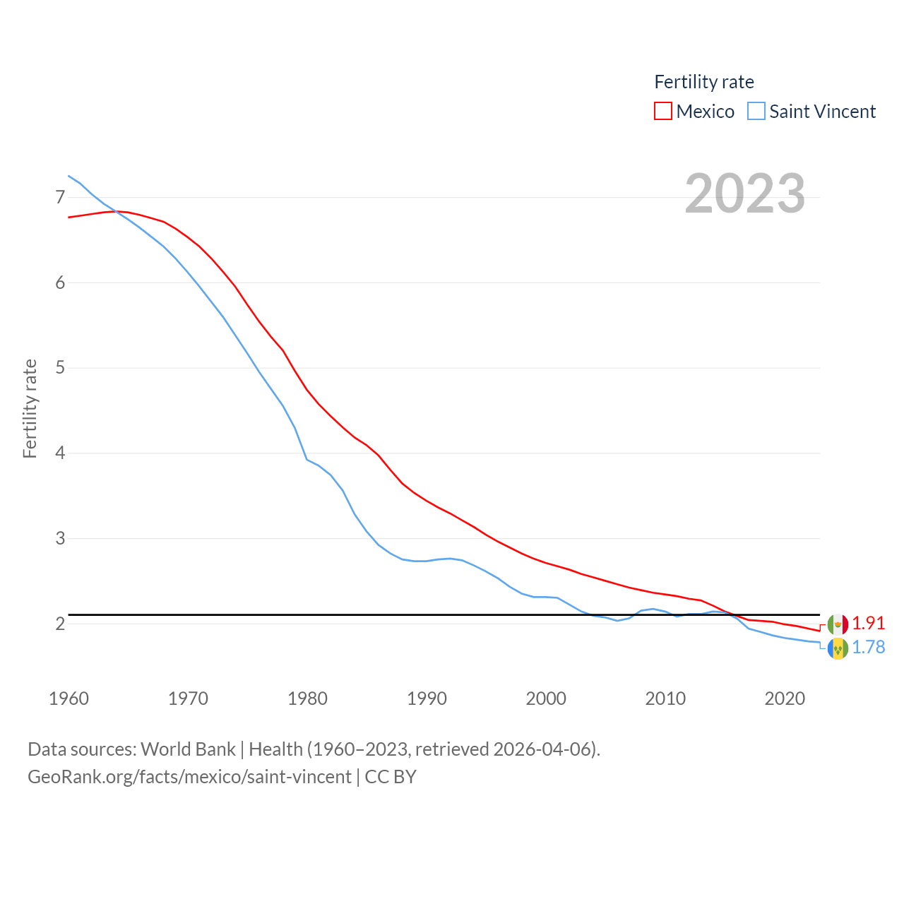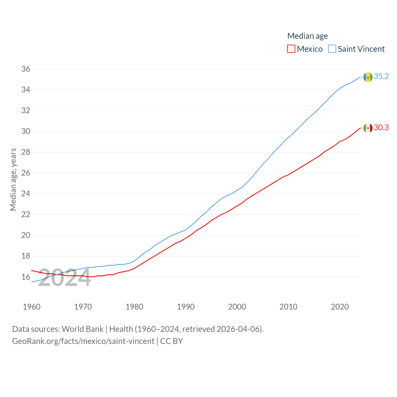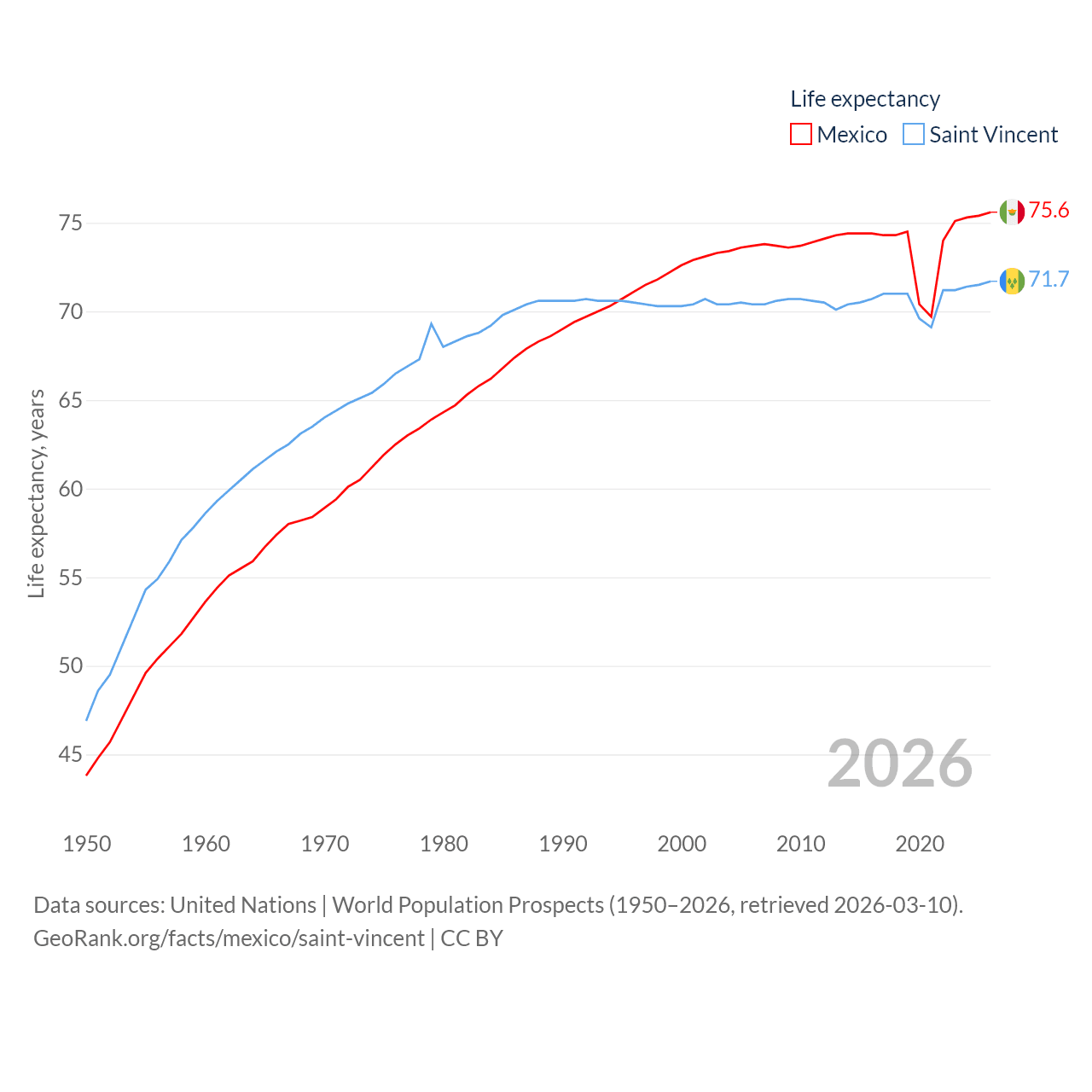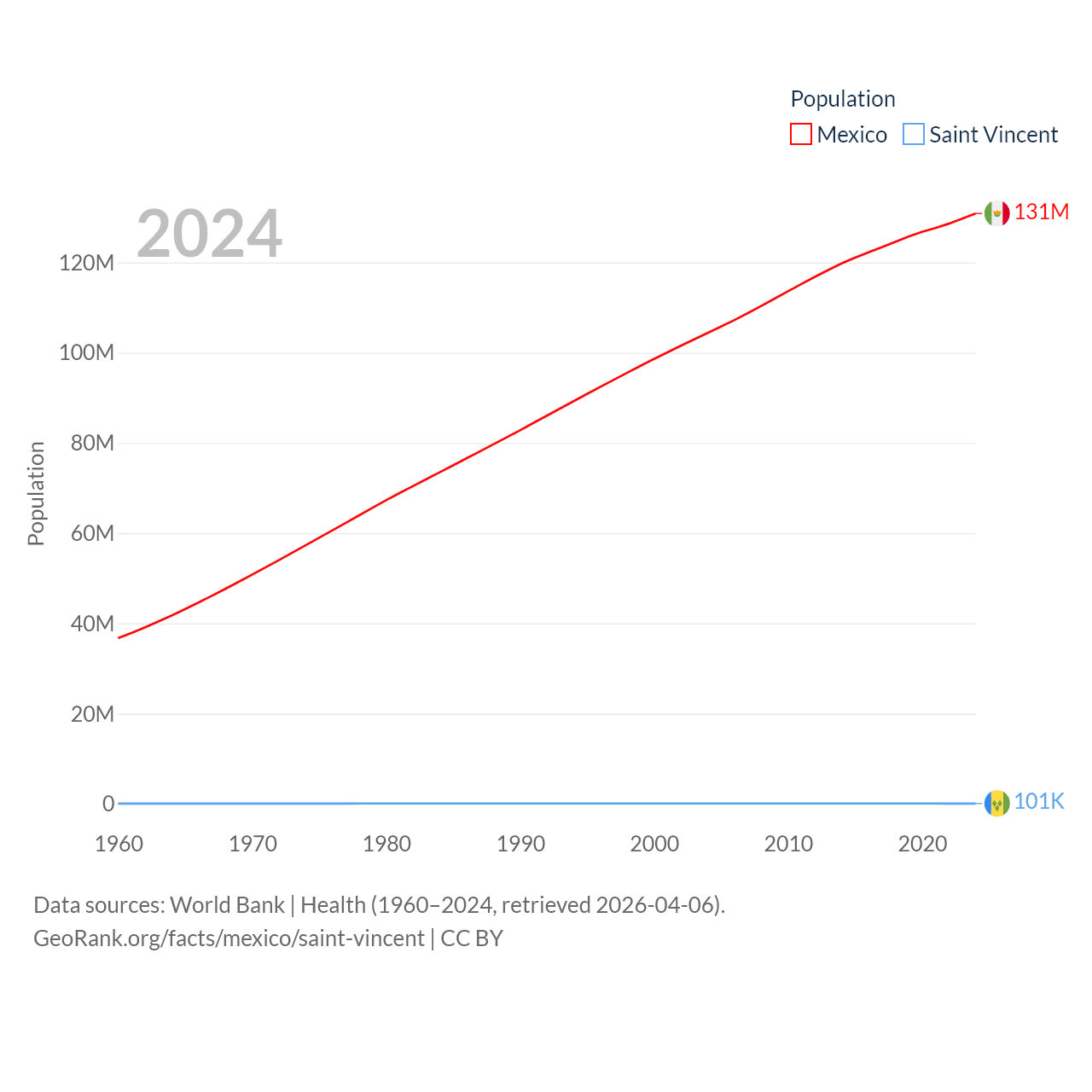 Mexico has a population of 131M (ranked 11/197), compared with 101K in Saint Vincent (ranked 184/197). Mexico's land area is 750,563 sq mi versus 150.6 sq mi for Saint Vincent (ranked 13th vs. 185th).