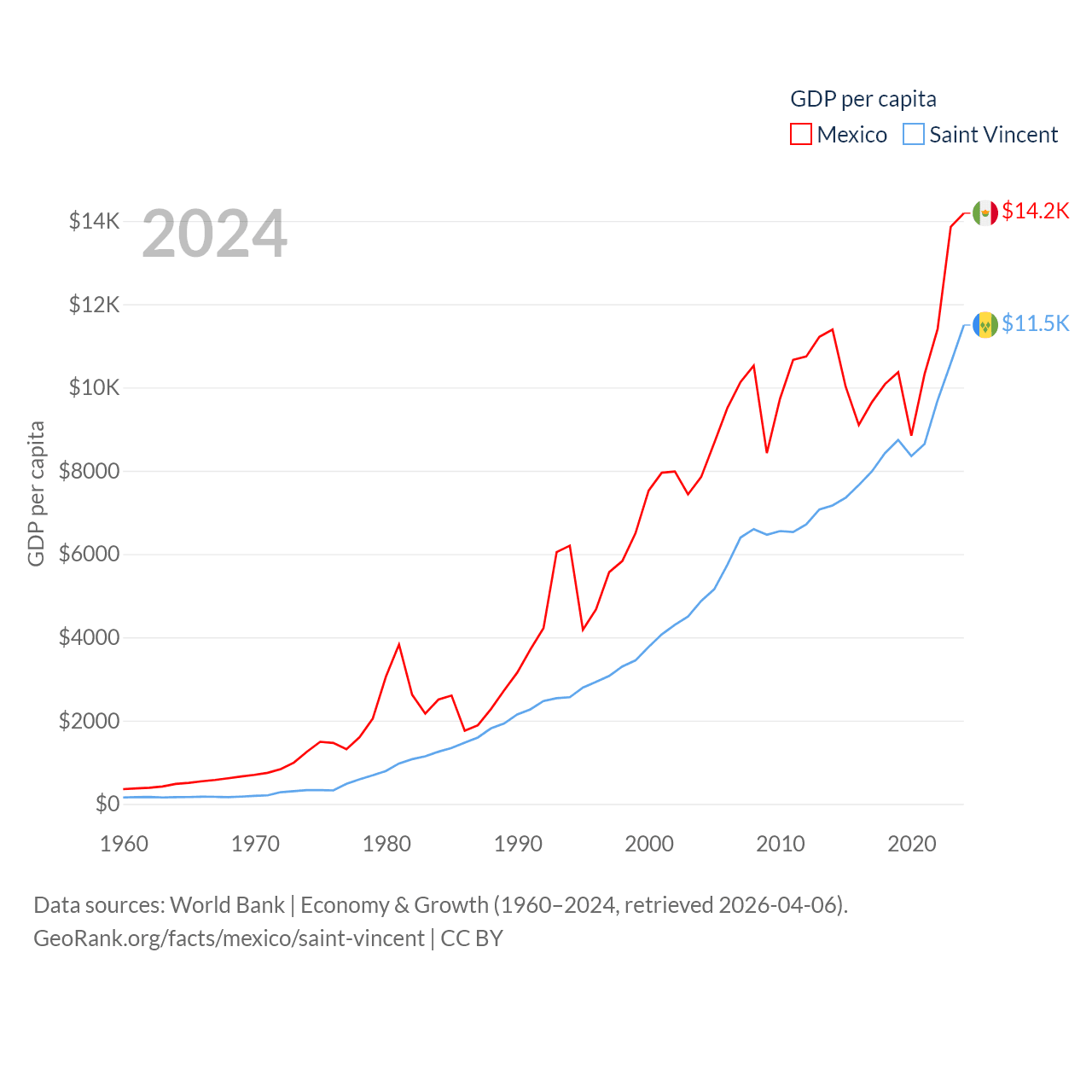 By GDP, Mexico ranks 13/197 ($1.86T) and Saint Vincent ranks 186/197 ($1.16B). By GDP per capita, Mexico ranks 69/197 ($14,186), while Saint Vincent ranks 81/197 ($11,501).