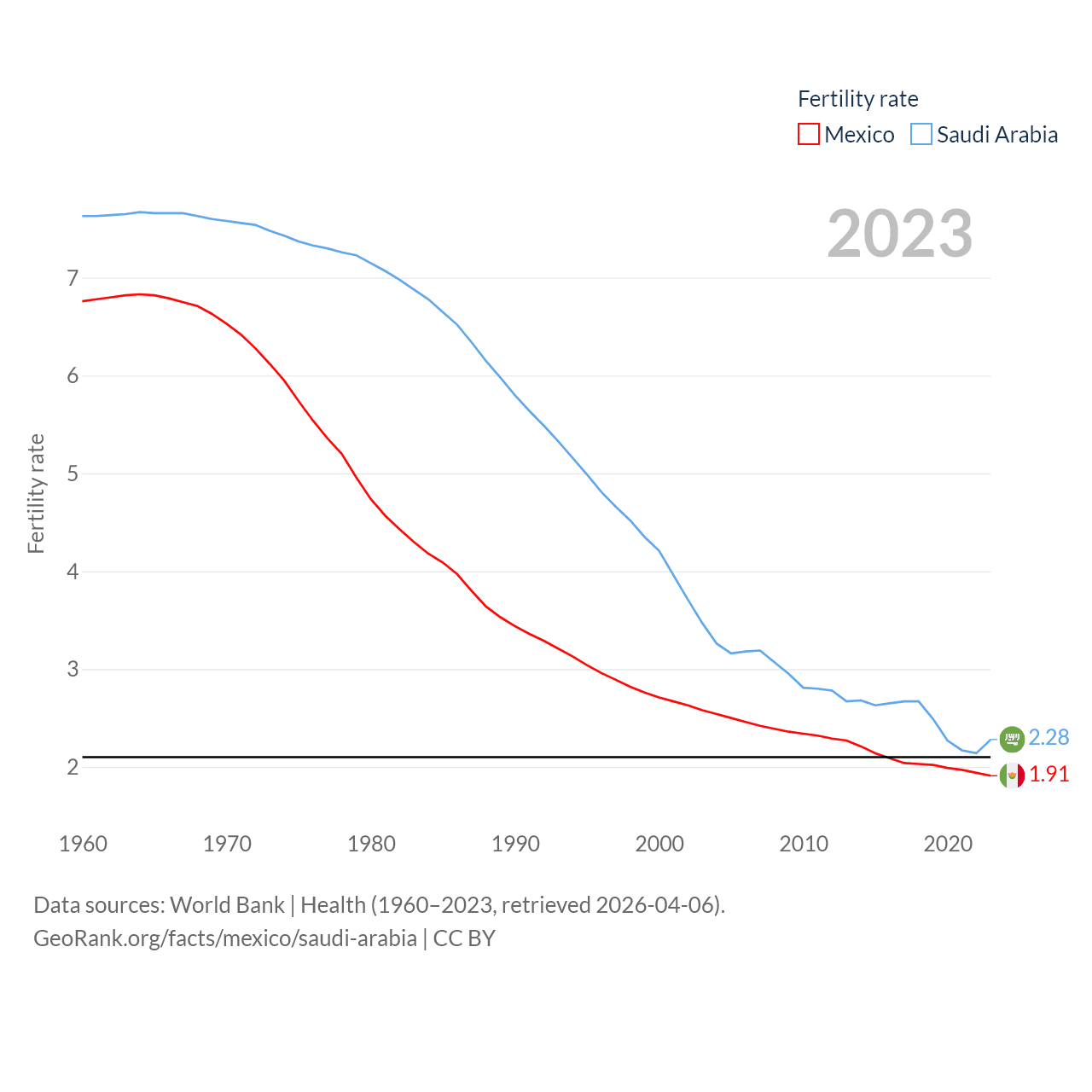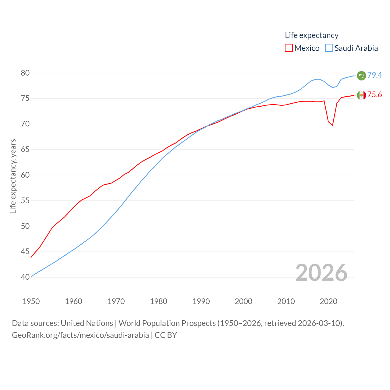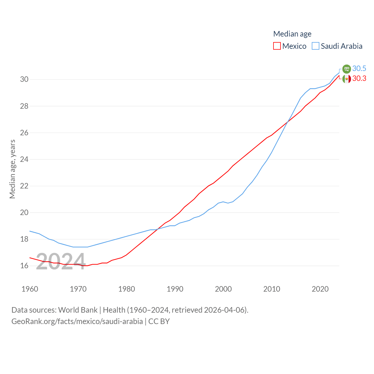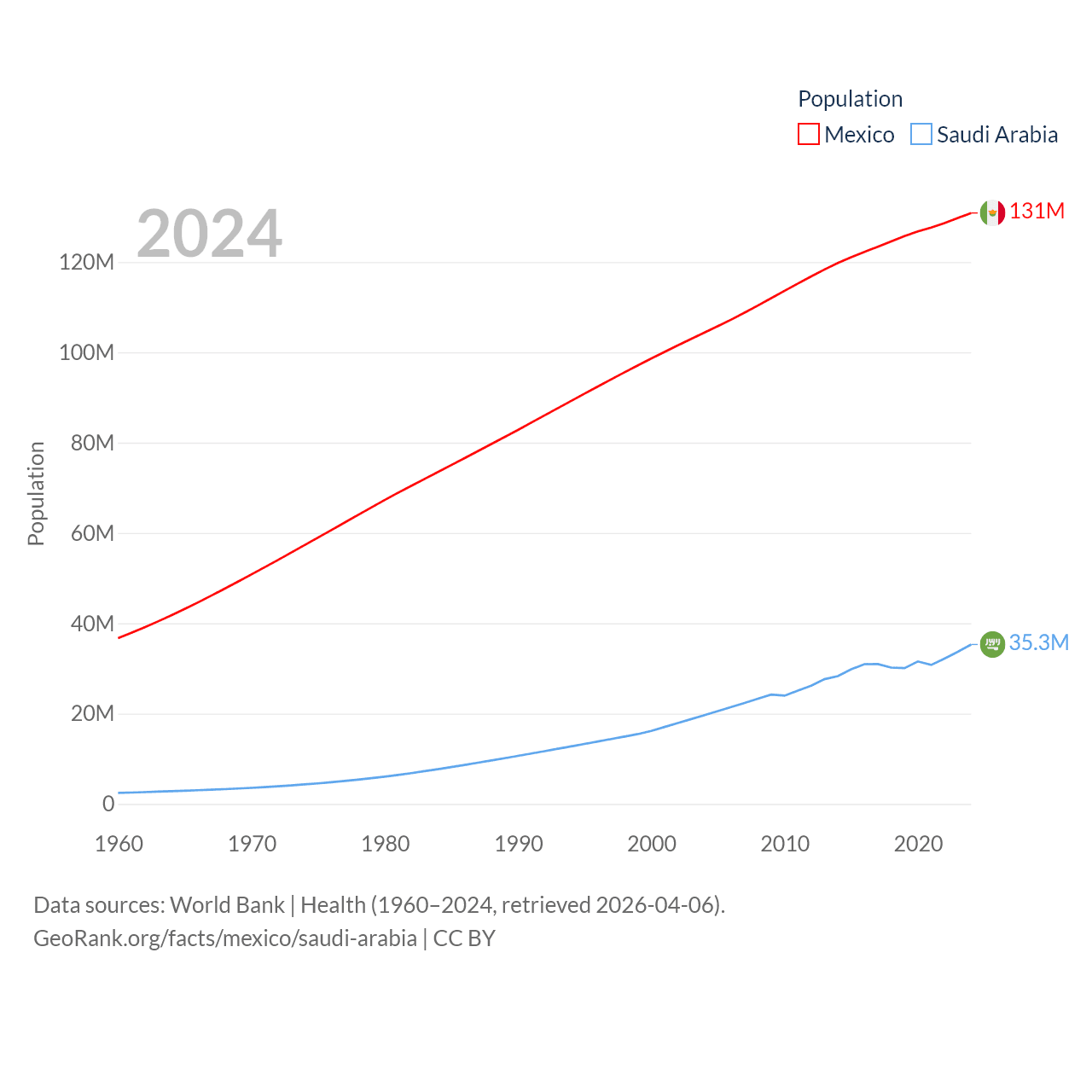 Mexico has a population of 131M (ranked 11/197), compared with 35.3M in Saudi Arabia (ranked 45/197). Mexico's land area is 750,563 sq mi versus 830,000 sq mi for Saudi Arabia (ranked 13th vs. 12th).