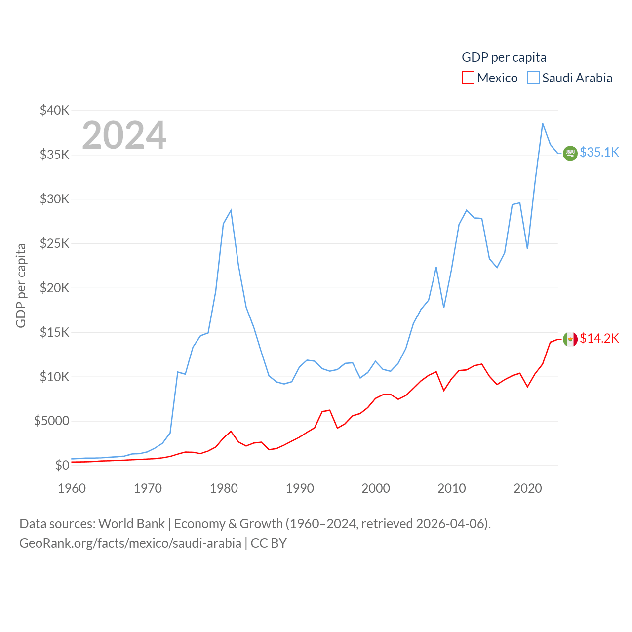 By GDP, Mexico ranks 13/197 ($1.86T) and Saudi Arabia ranks 18/197 ($1.24T). By GDP per capita, Mexico ranks 69/197 ($14,186), while Saudi Arabia ranks 33/197 ($35,122).