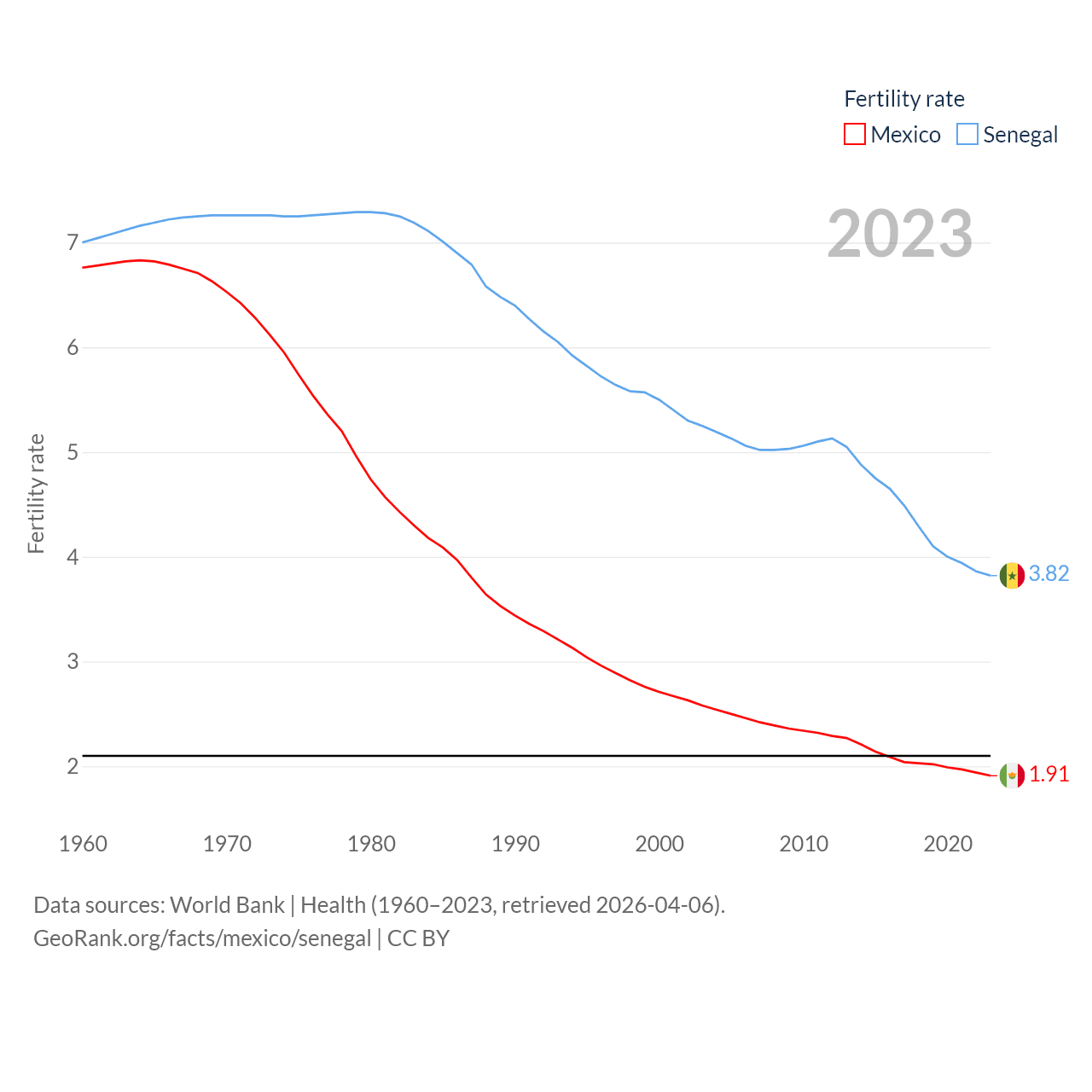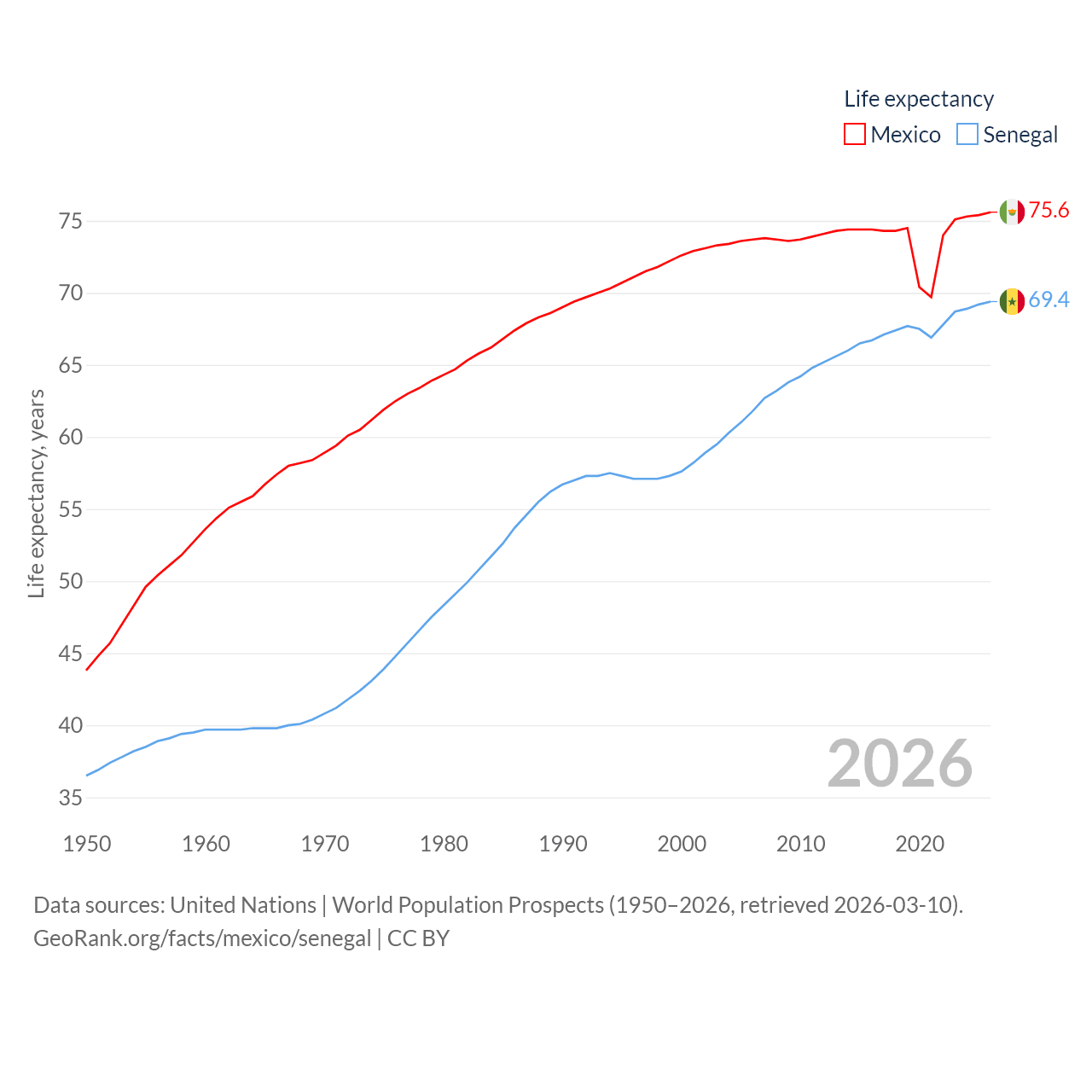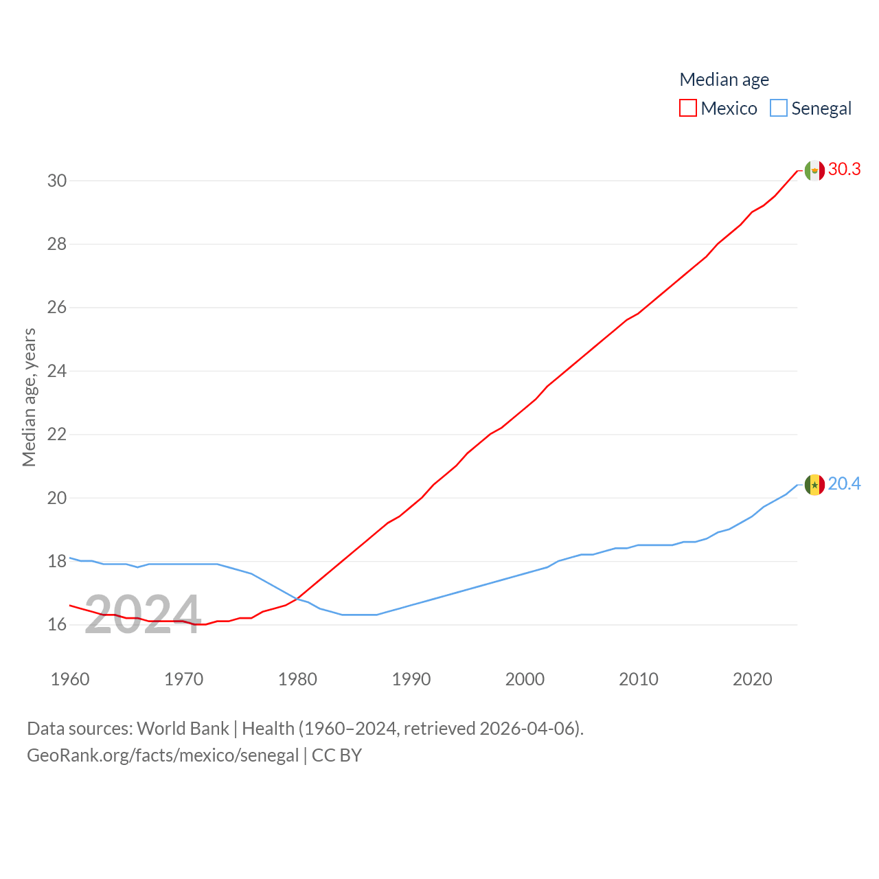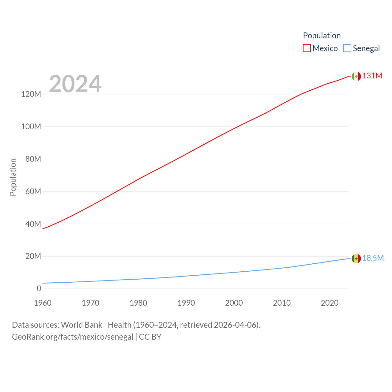 Mexico has a population of 131M (ranked 11/197), compared with 18.5M in Senegal (ranked 69/197). Mexico's land area is 750,563 sq mi versus 74,336 sq mi for Senegal (ranked 13th vs. 85th).