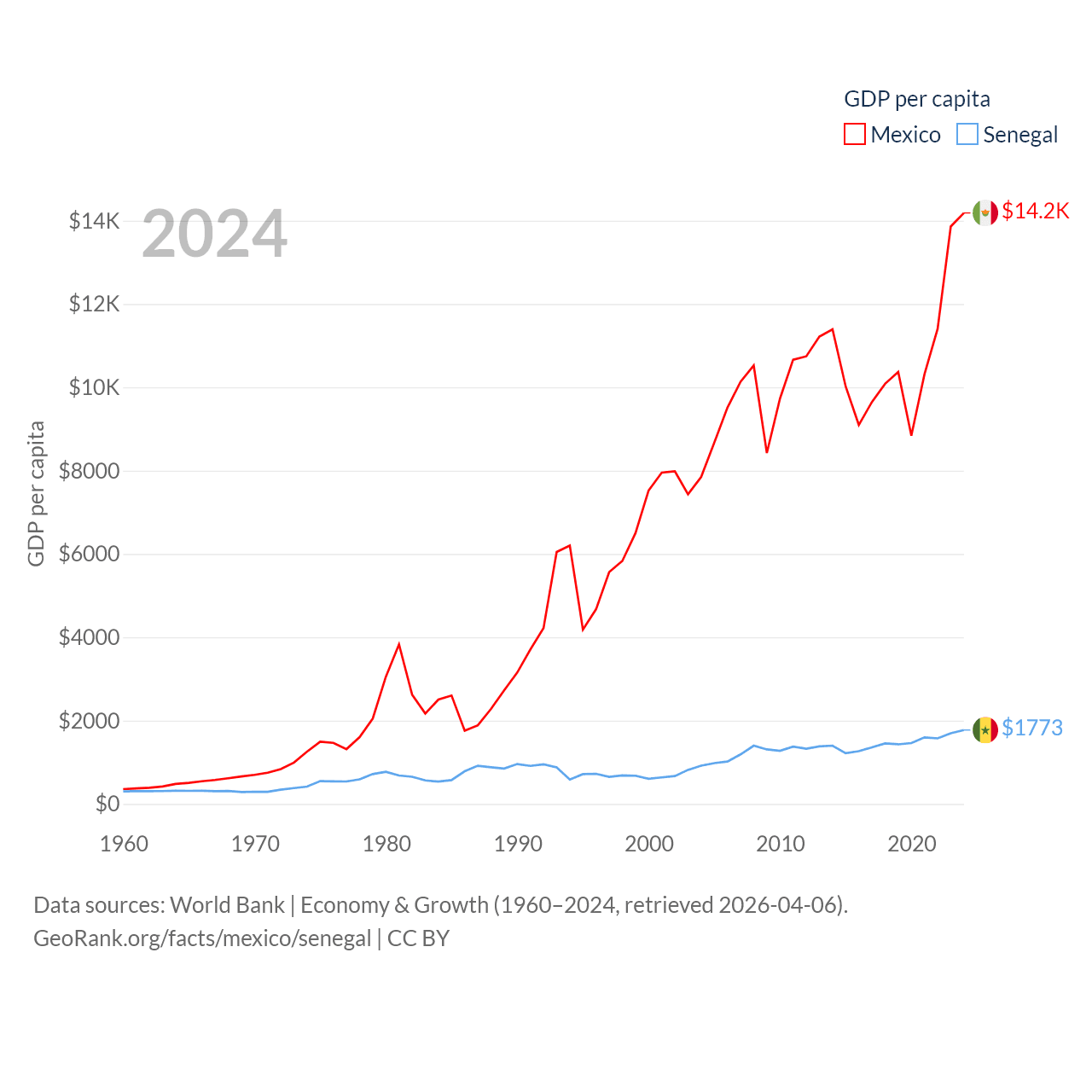 By GDP, Mexico ranks 13/197 ($1.86T) and Senegal ranks 109/197 ($32.8B). By GDP per capita, Mexico ranks 69/197 ($14,186), while Senegal ranks 159/197 ($1,773).