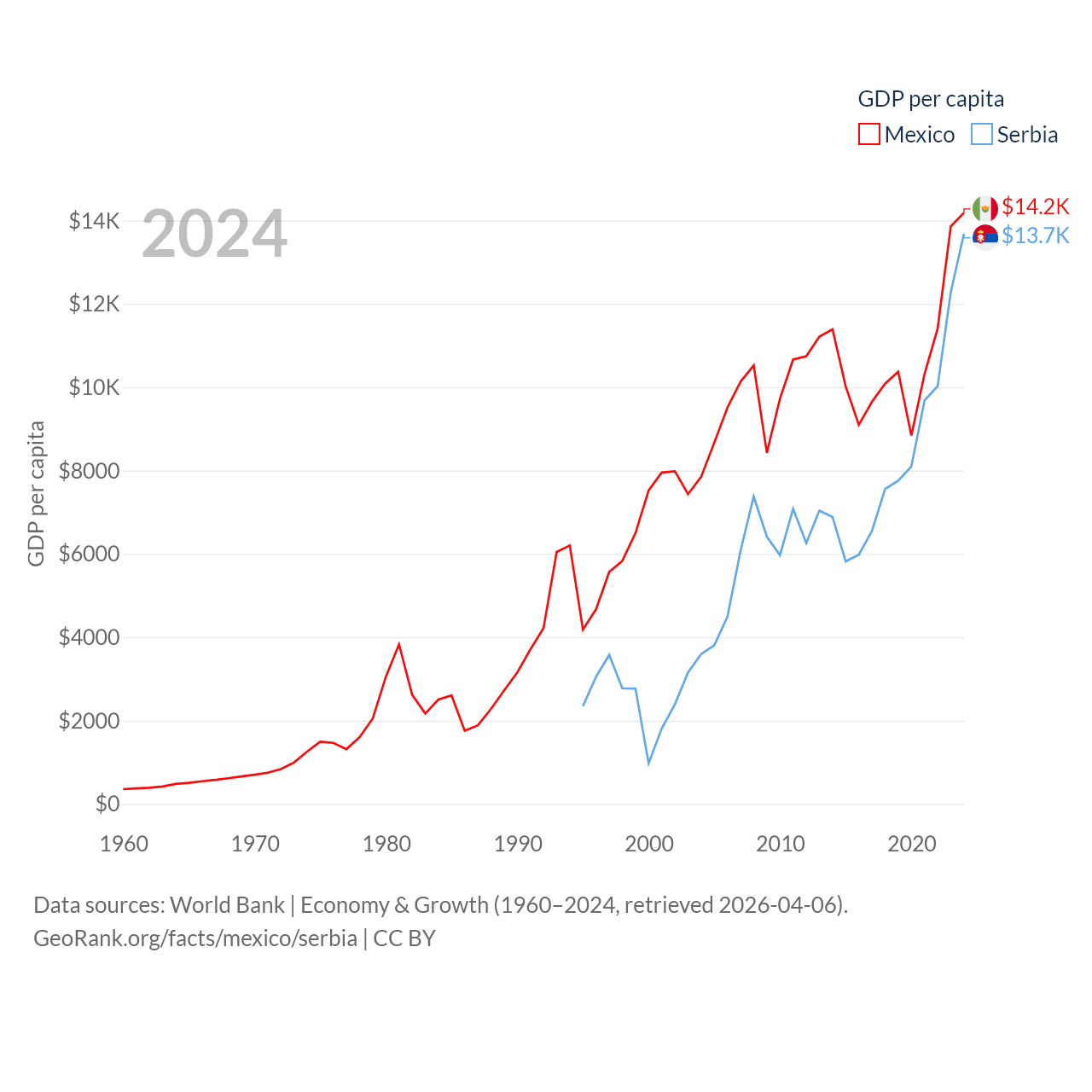 By GDP, Mexico ranks 13/197 ($1.86T) and Serbia ranks 76/197 ($90.1B). By GDP per capita, Mexico ranks 69/197 ($14,186), while Serbia ranks 73/197 ($13,679).