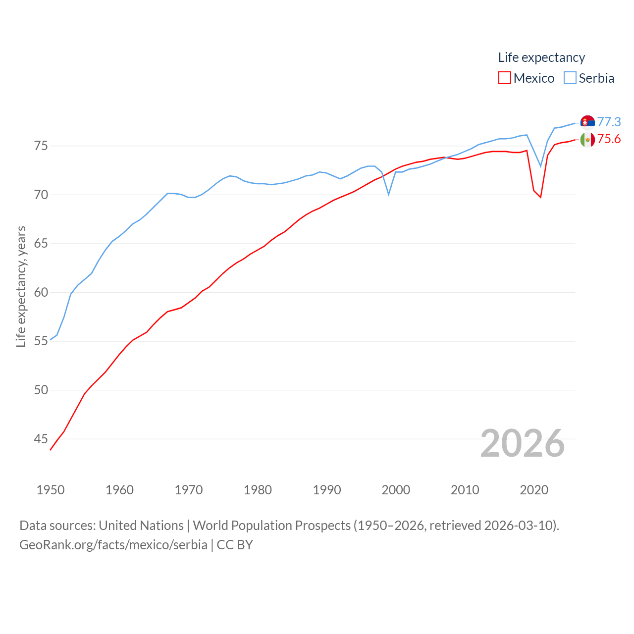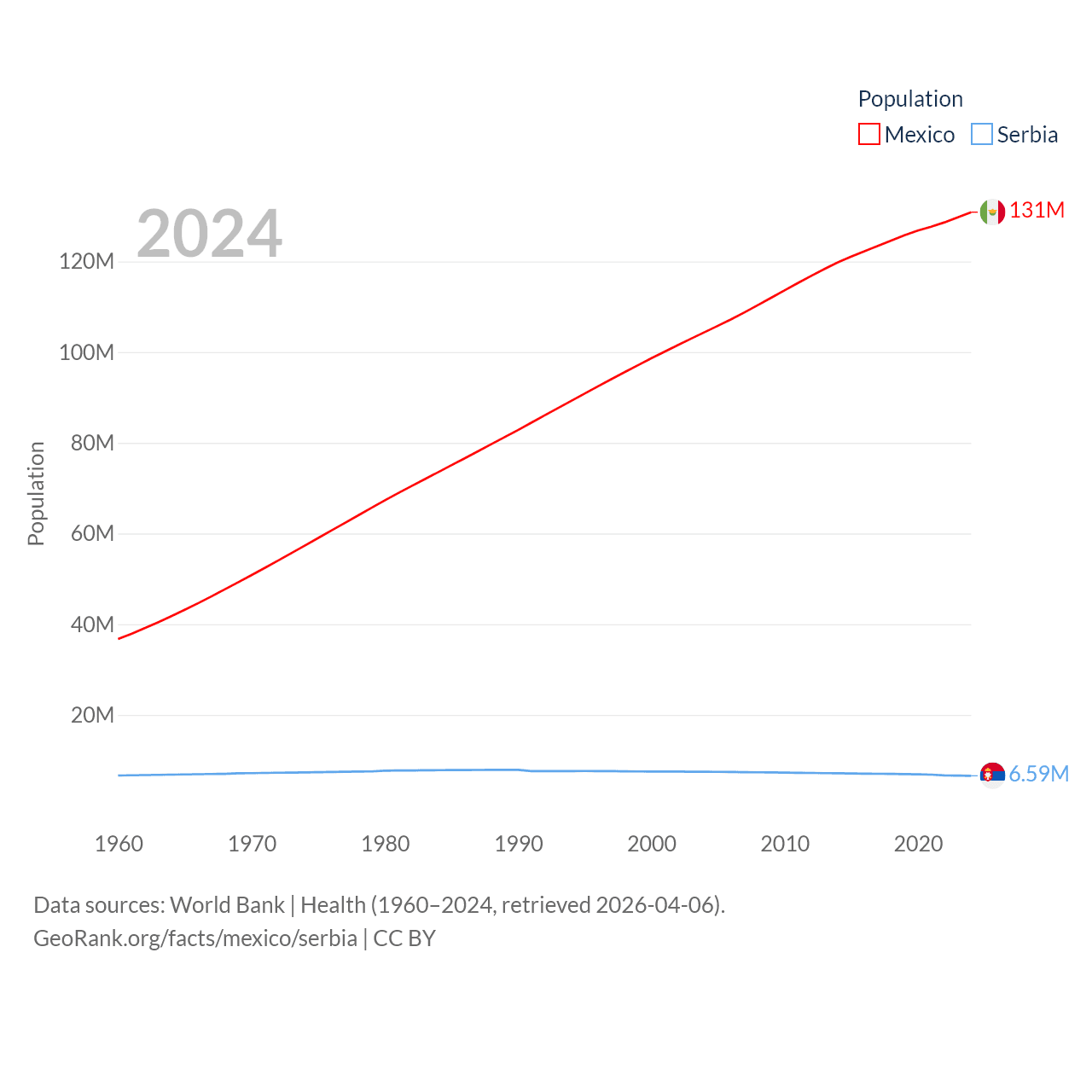 Mexico has a population of 131M (ranked 11/197), compared with 6.59M in Serbia (ranked 109/197). Mexico's land area is 750,563 sq mi versus 32,467 sq mi for Serbia (ranked 13th vs. 111th).