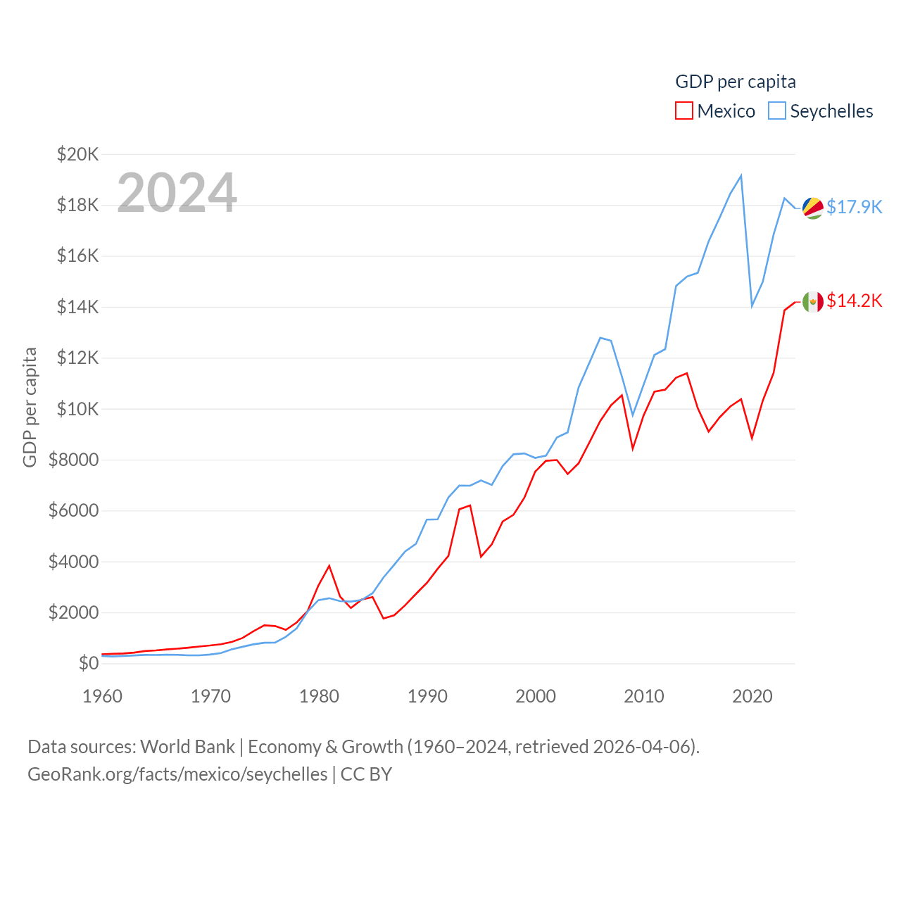 By GDP, Mexico ranks 13/197 ($1.86T) and The Seychelles ranks 178/197 ($2.17B). By GDP per capita, Mexico ranks 69/197 ($14,186), while The Seychelles ranks 63/197 ($17,859).