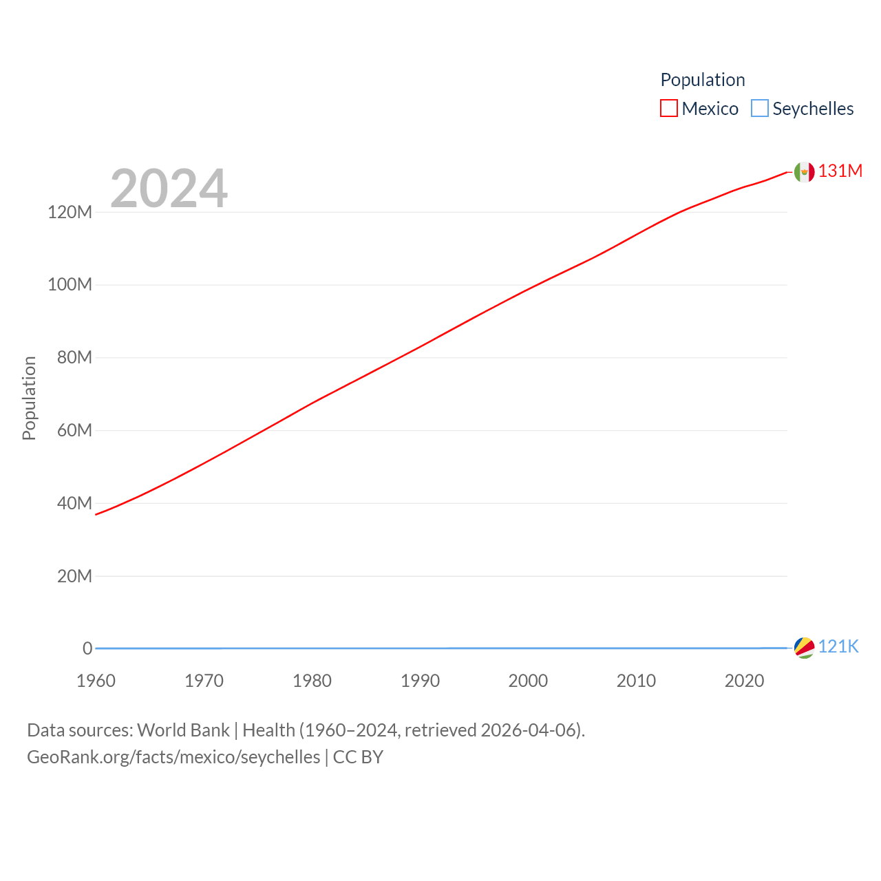 Mexico has a population of 131M (ranked 11/197), compared with 121K in The Seychelles (ranked 181/197). Mexico's land area is 750,563 sq mi versus 177.6 sq mi for The Seychelles (ranked 13th vs. 181st).