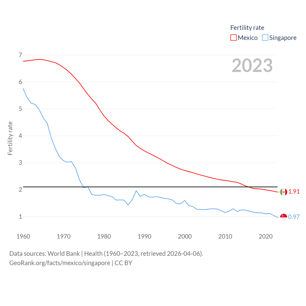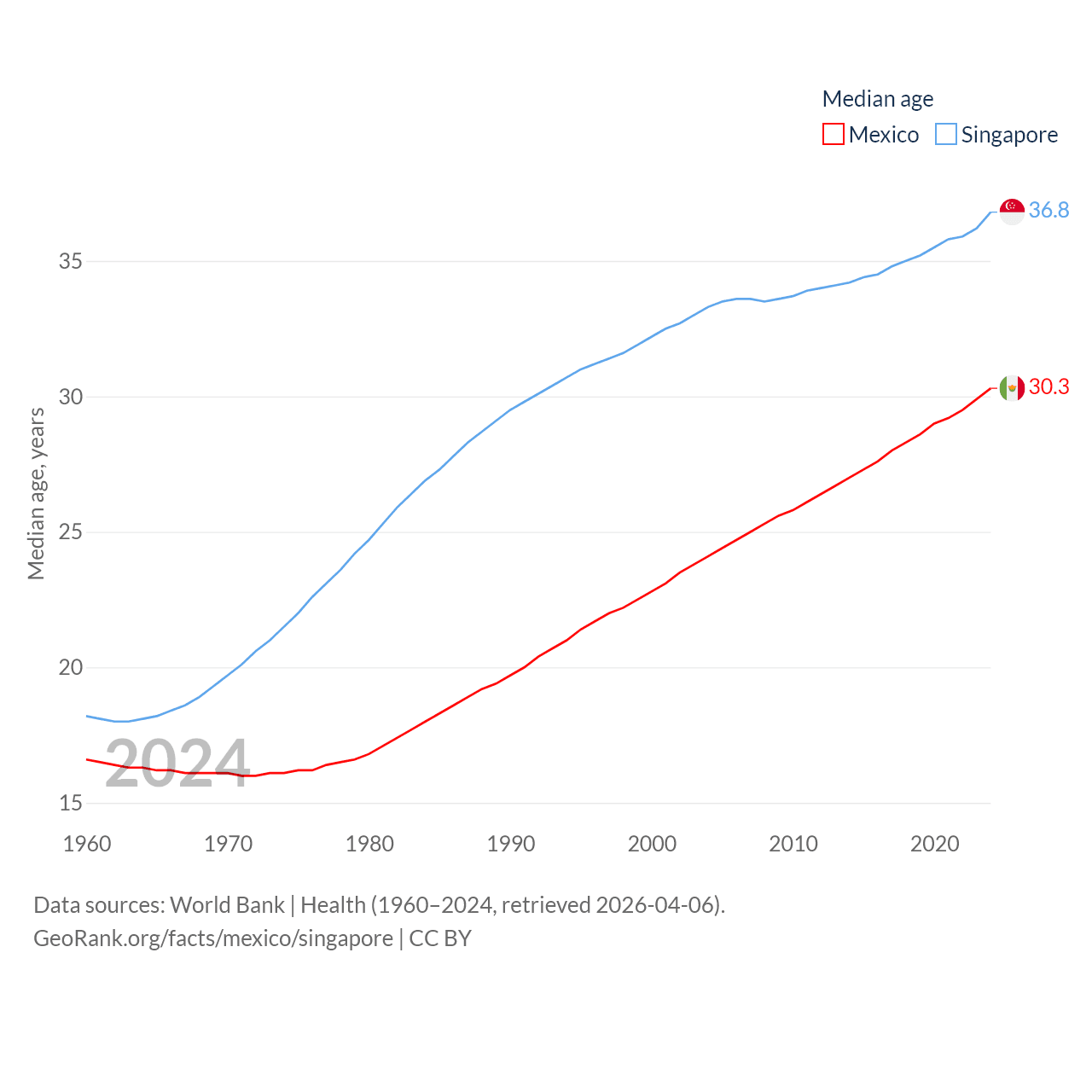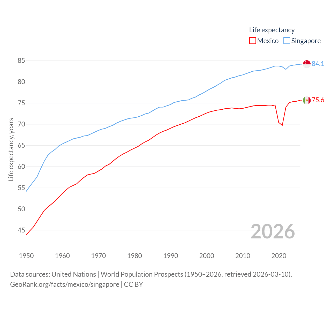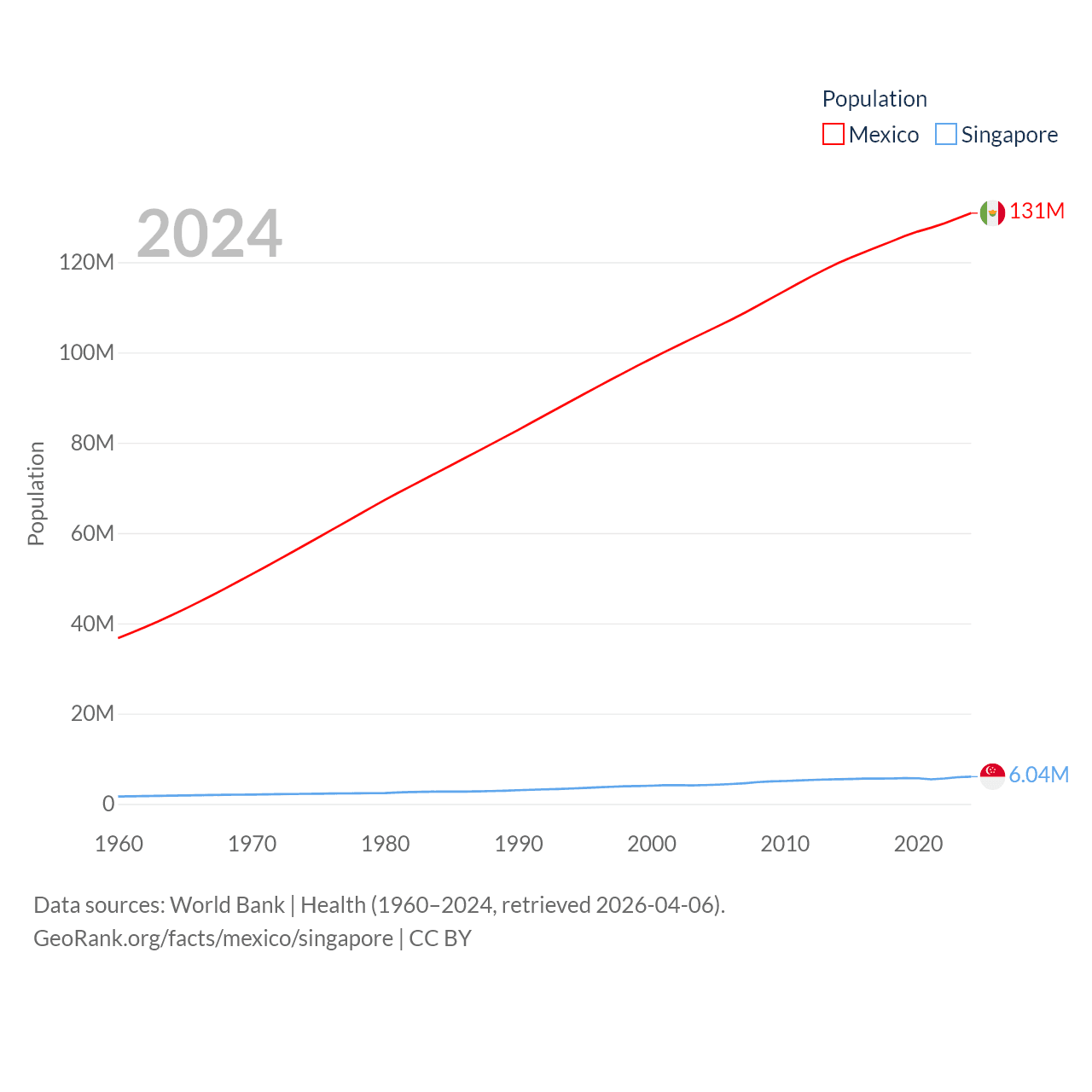 Mexico has a population of 131M (ranked 11/197), compared with 6.04M in Singapore (ranked 113/197). Mexico's land area is 750,563 sq mi versus 277.2 sq mi for Singapore (ranked 13th vs. 177th).