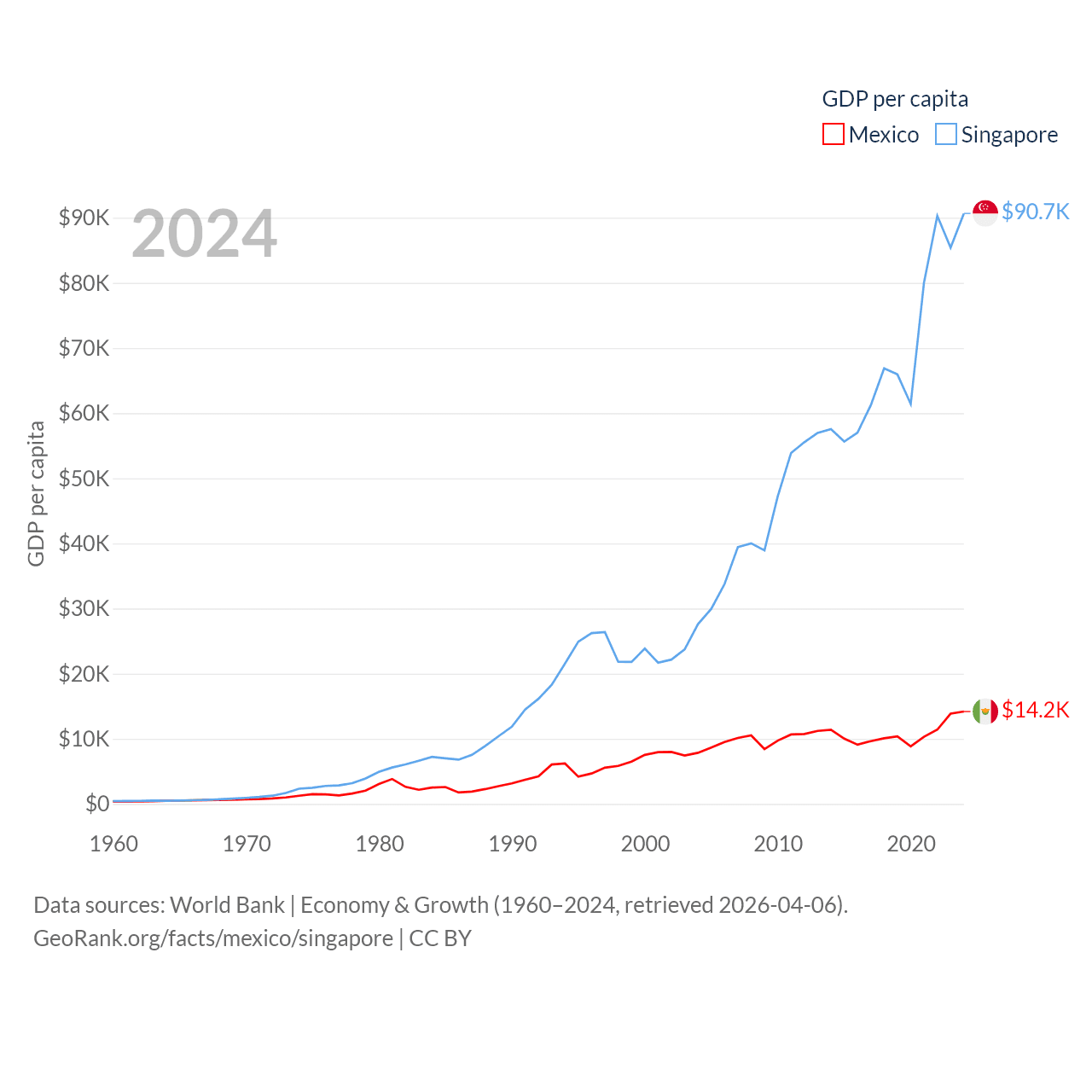 By GDP, Mexico ranks 13/197 ($1.86T) and Singapore ranks 28/197 ($547B). By GDP per capita, Mexico ranks 69/197 ($14,186), while Singapore ranks 7/197 ($90,674).