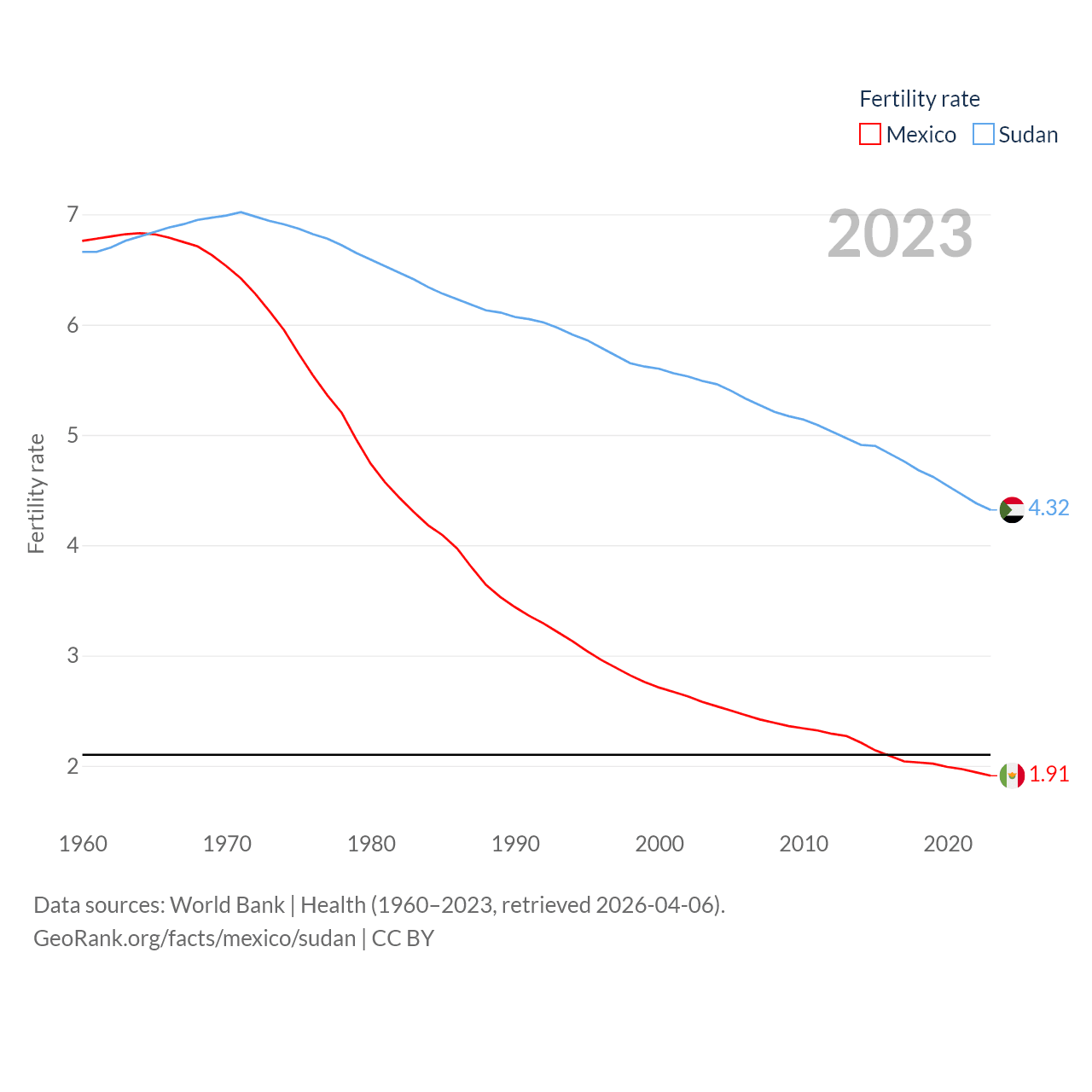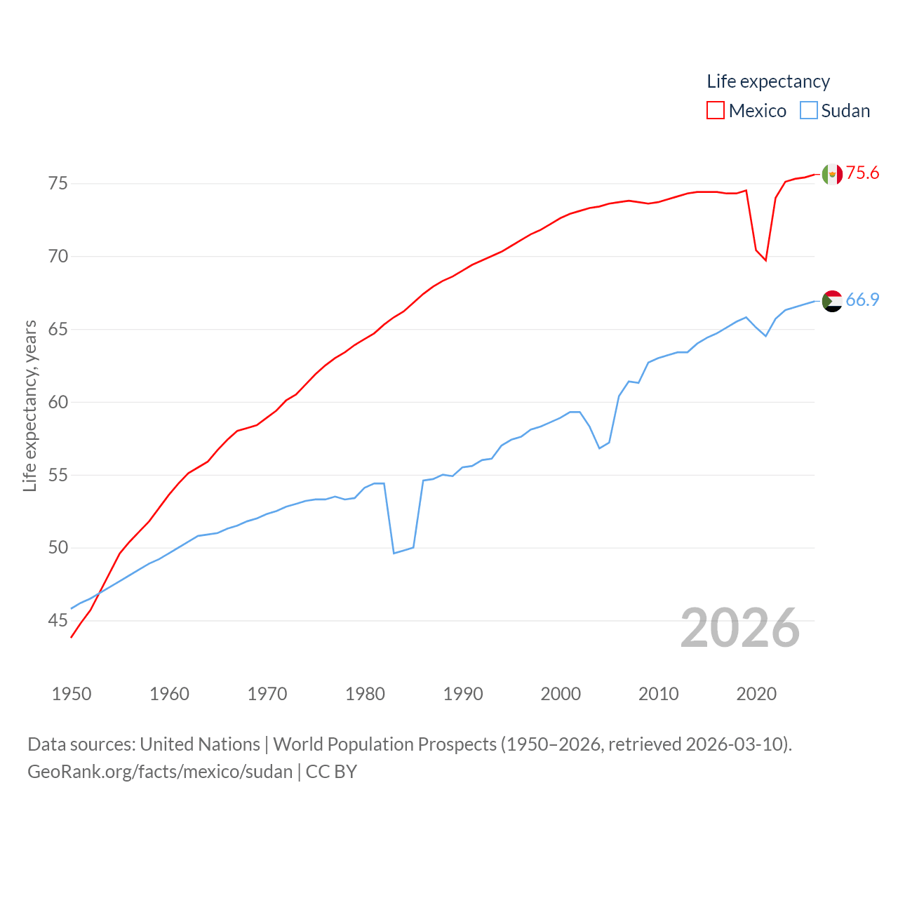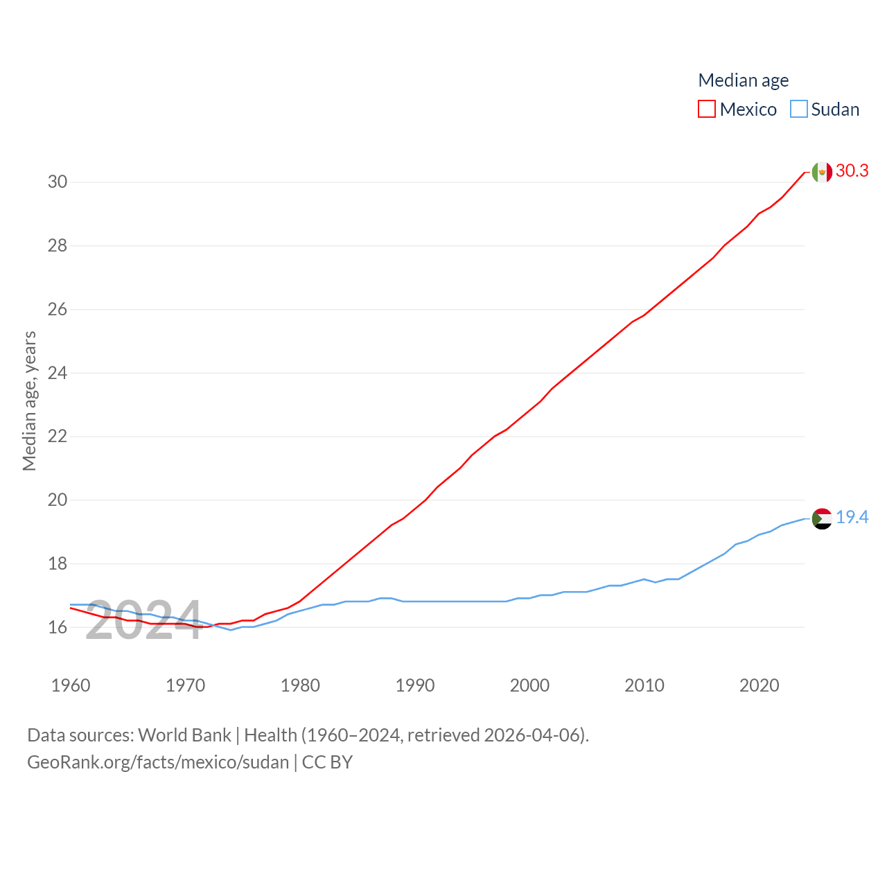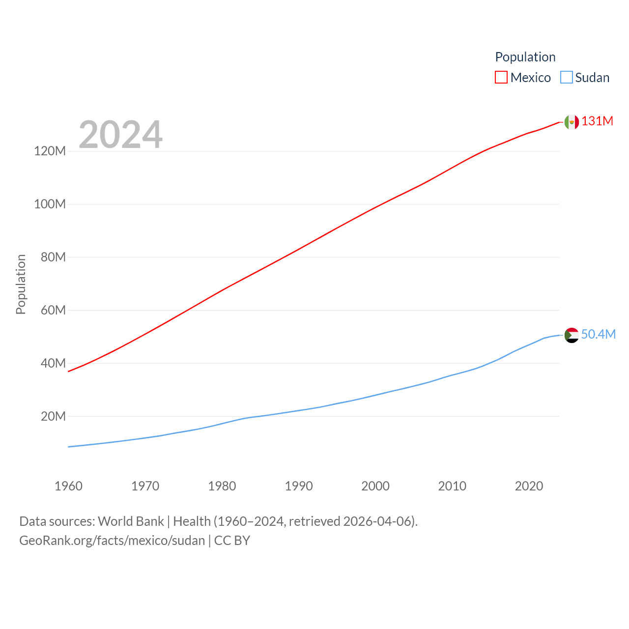 Mexico has a population of 131M (ranked 11/197), compared with 50.4M in Sudan (ranked 30/197). Mexico's land area is 750,563 sq mi versus 721,239 sq mi for Sudan (ranked 13th vs. 15th).