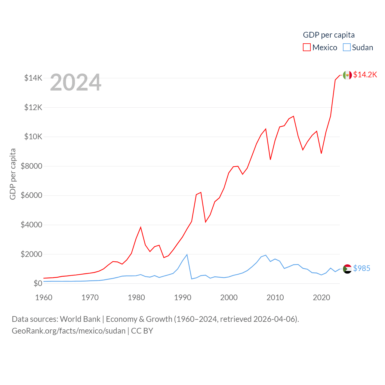 By GDP, Mexico ranks 13/197 ($1.86T) and Sudan ranks 94/197 ($49.7B). By GDP per capita, Mexico ranks 69/197 ($14,186), while Sudan ranks 179/197 ($985).