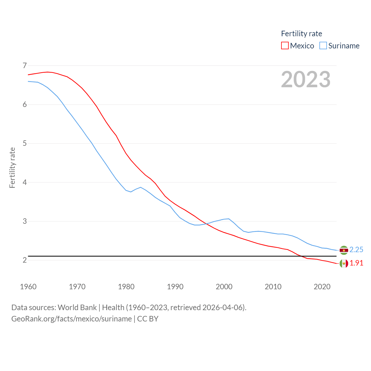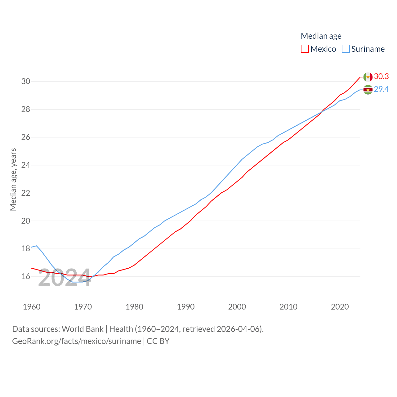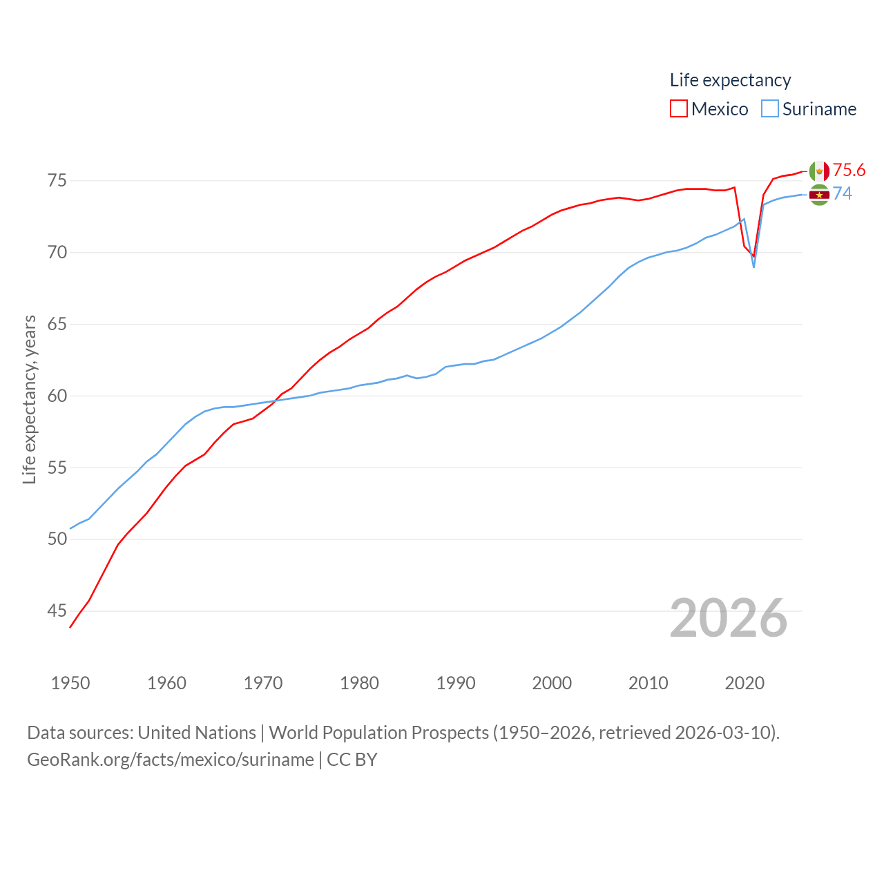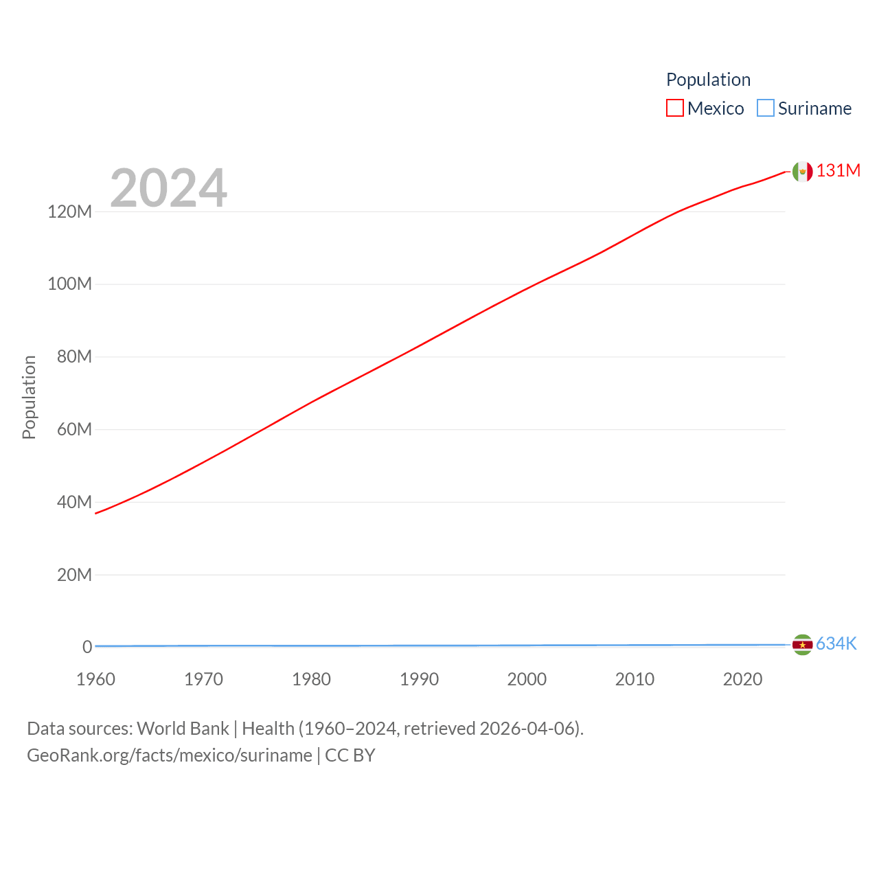 Mexico has a population of 131M (ranked 11/197), compared with 634K in Suriname (ranked 165/197). Mexico's land area is 750,563 sq mi versus 61,972 sq mi for Suriname (ranked 13th vs. 90th).
