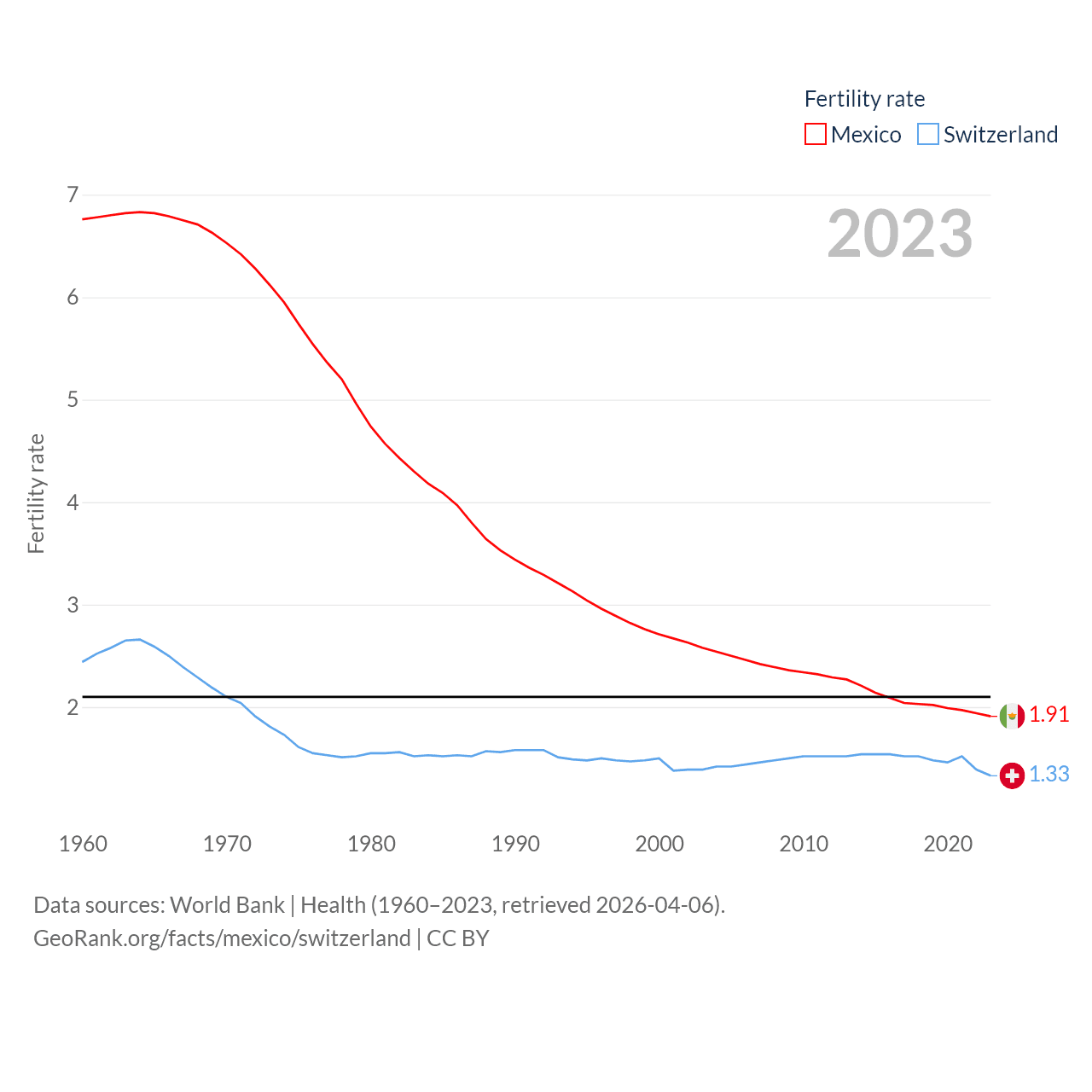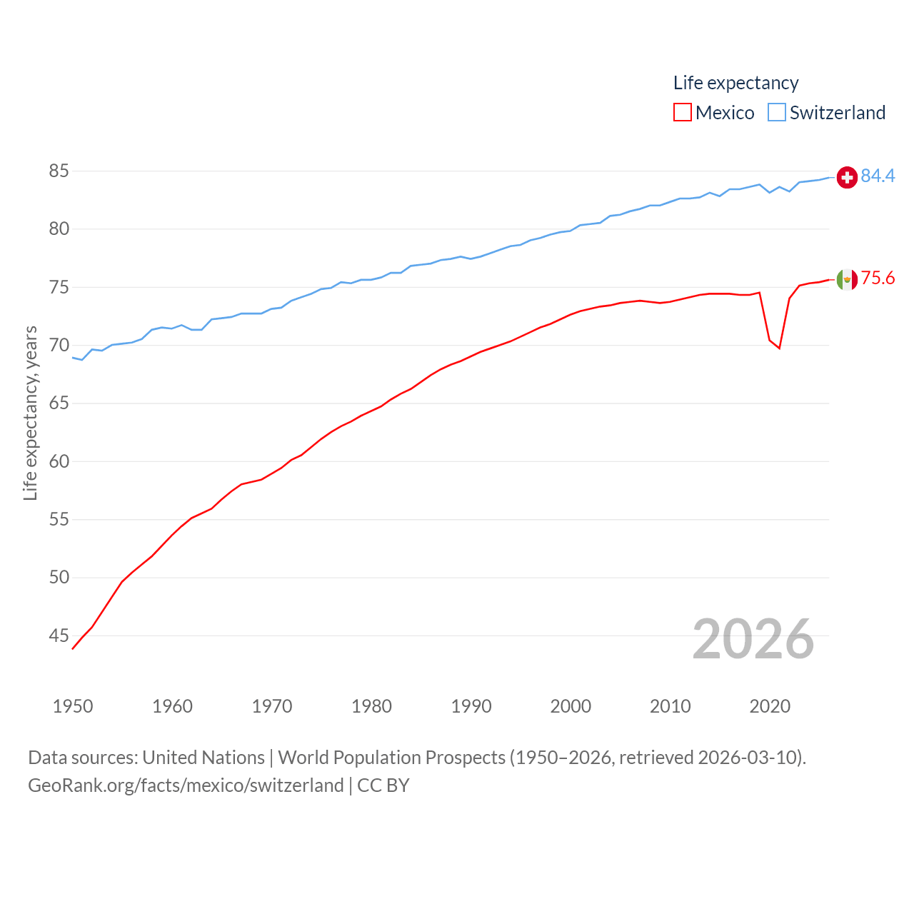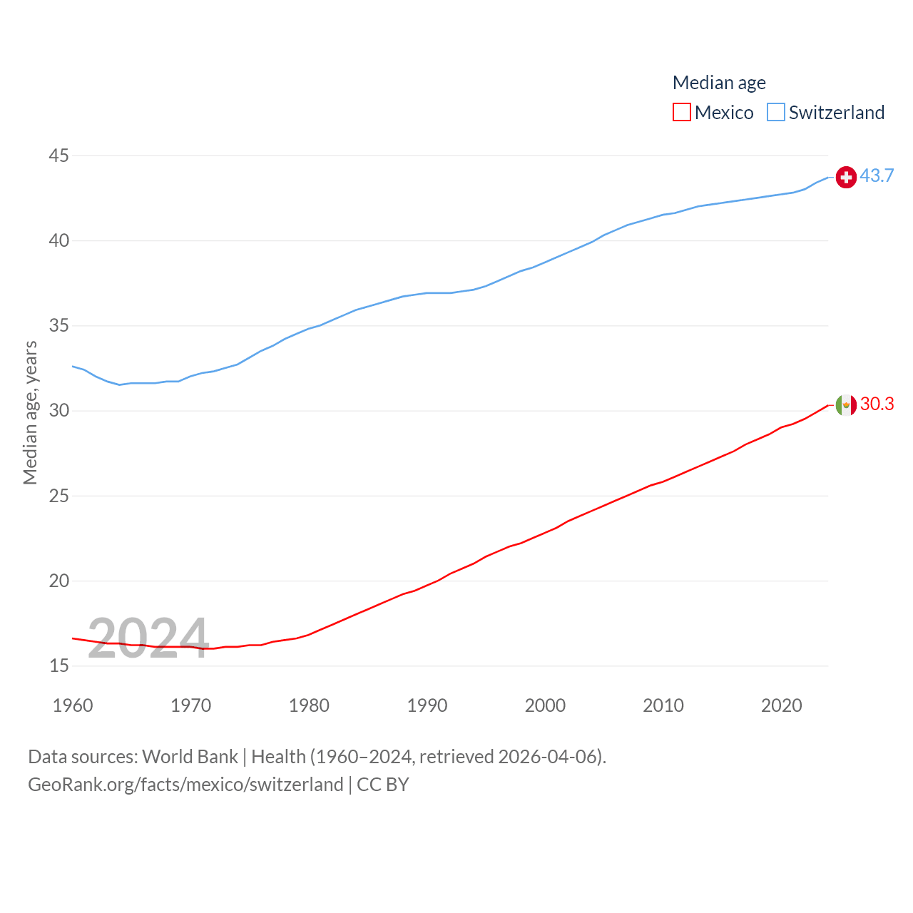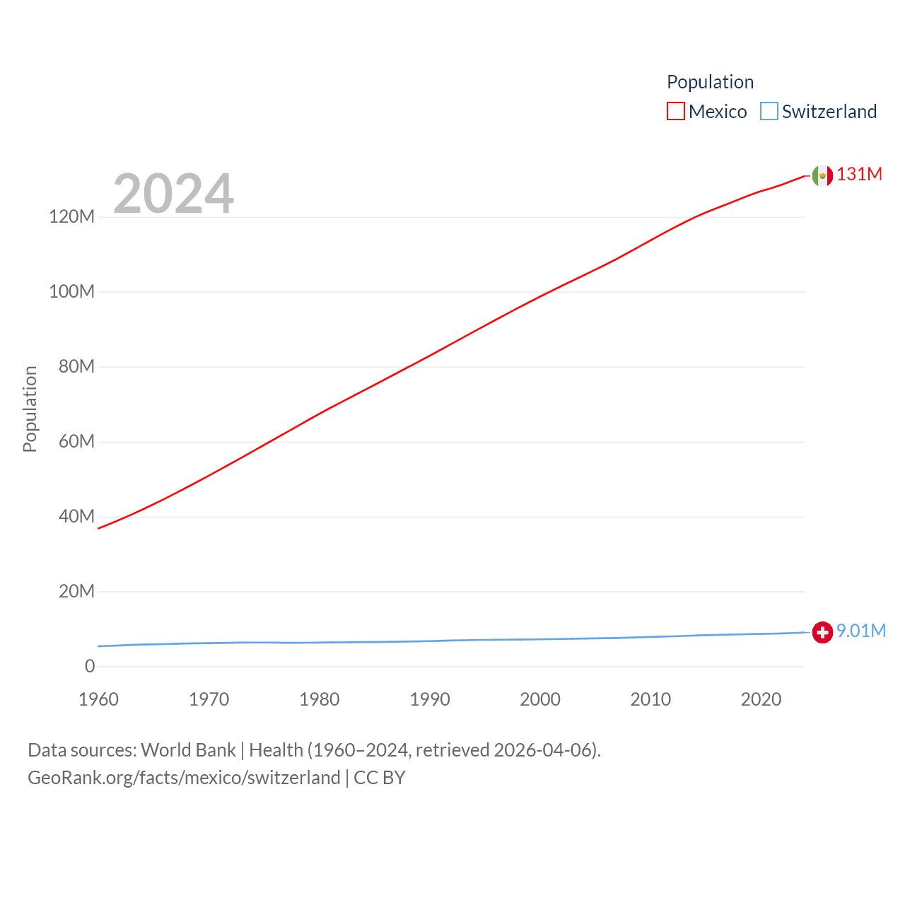 Mexico has a population of 131M (ranked 11/197), compared with 9.01M in Switzerland (ranked 101/197). Mexico's land area is 750,563 sq mi versus 15,255 sq mi for Switzerland (ranked 13th vs. 131st).