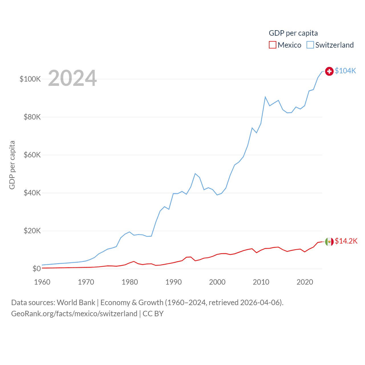 By GDP, Mexico ranks 13/197 ($1.86T) and Switzerland ranks 20/197 ($937B). By GDP per capita, Mexico ranks 69/197 ($14,186), while Switzerland ranks 5/197 ($103,998).