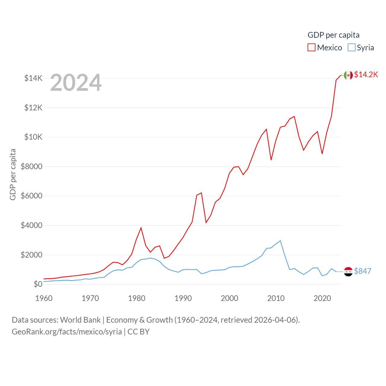 By GDP, Mexico ranks 13/197 ($1.86T) and Syria ranks 129/197 ($20B). By GDP per capita, Mexico ranks 69/197 ($14,186), while Syria ranks 185/197 ($847).
