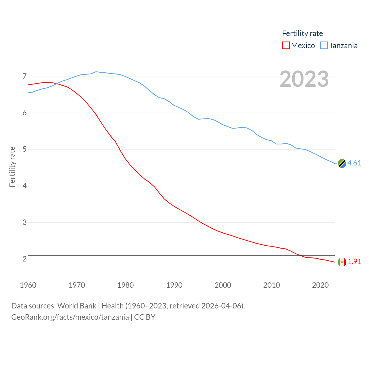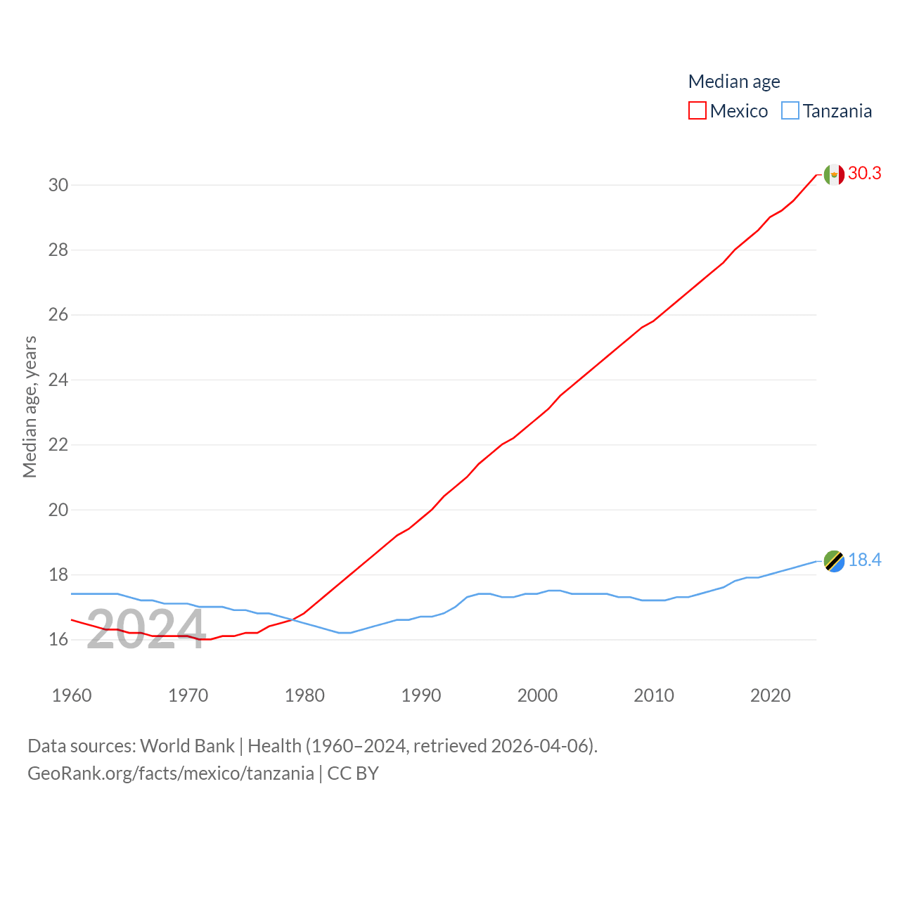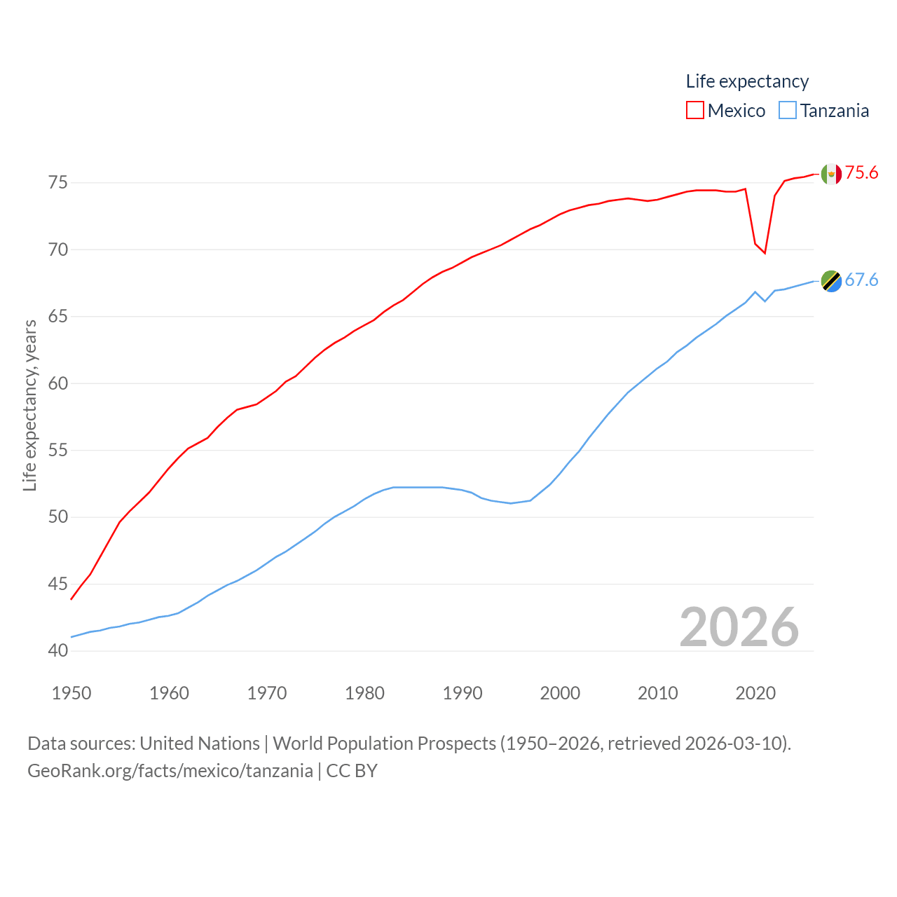 Mexico has a population of 131M (ranked 11/197), compared with 68.6M in Tanzania (ranked 22/197). Mexico's land area is 750,563 sq mi versus 342,009 sq mi for Tanzania (ranked 13th vs. 31st).