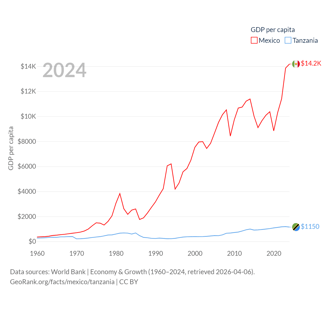 By GDP, Mexico ranks 13/197 ($1.86T) and Tanzania ranks 82/197 ($78.8B). By GDP per capita, Mexico ranks 69/197 ($14,186), while Tanzania ranks 170/197 ($1,150).